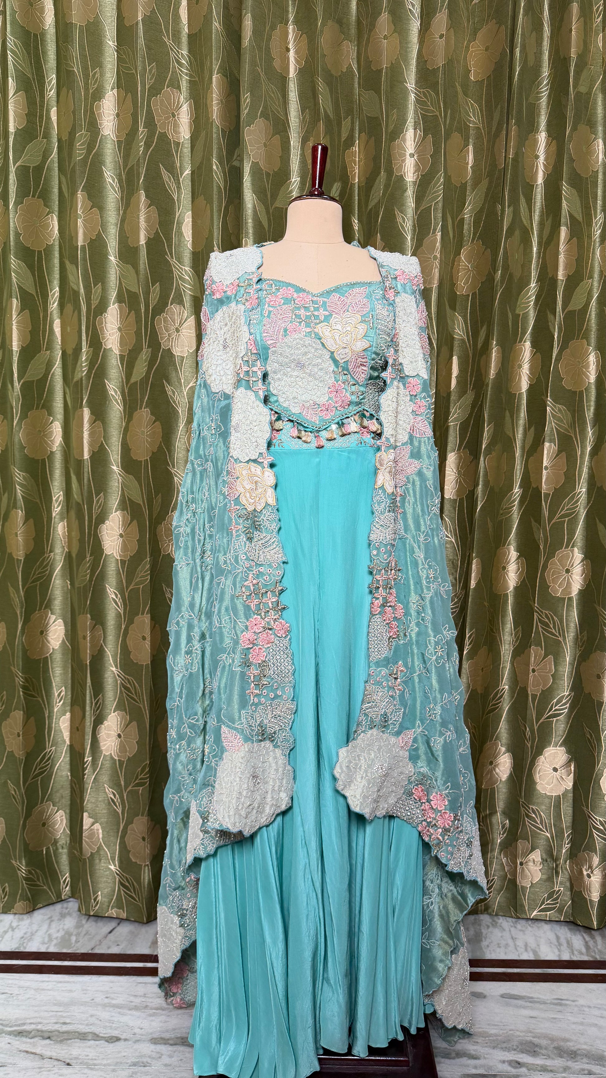 Aqua Blue Indo-Western 3-Piece Ensemble with Hand-Embroidered Blouse & Sharara in Pure Crepe and Heavy Pure Tissue Kaftan Shrug