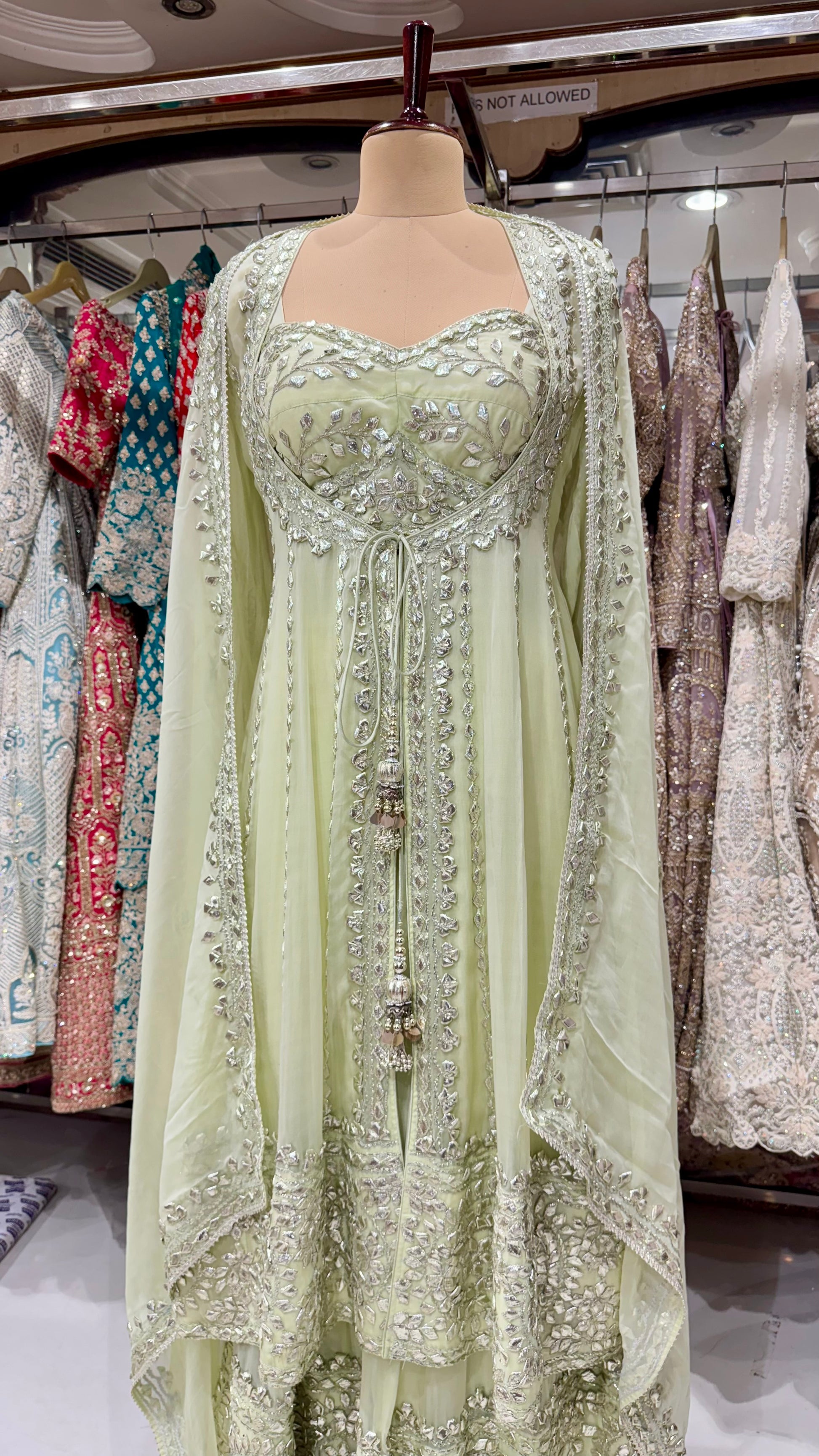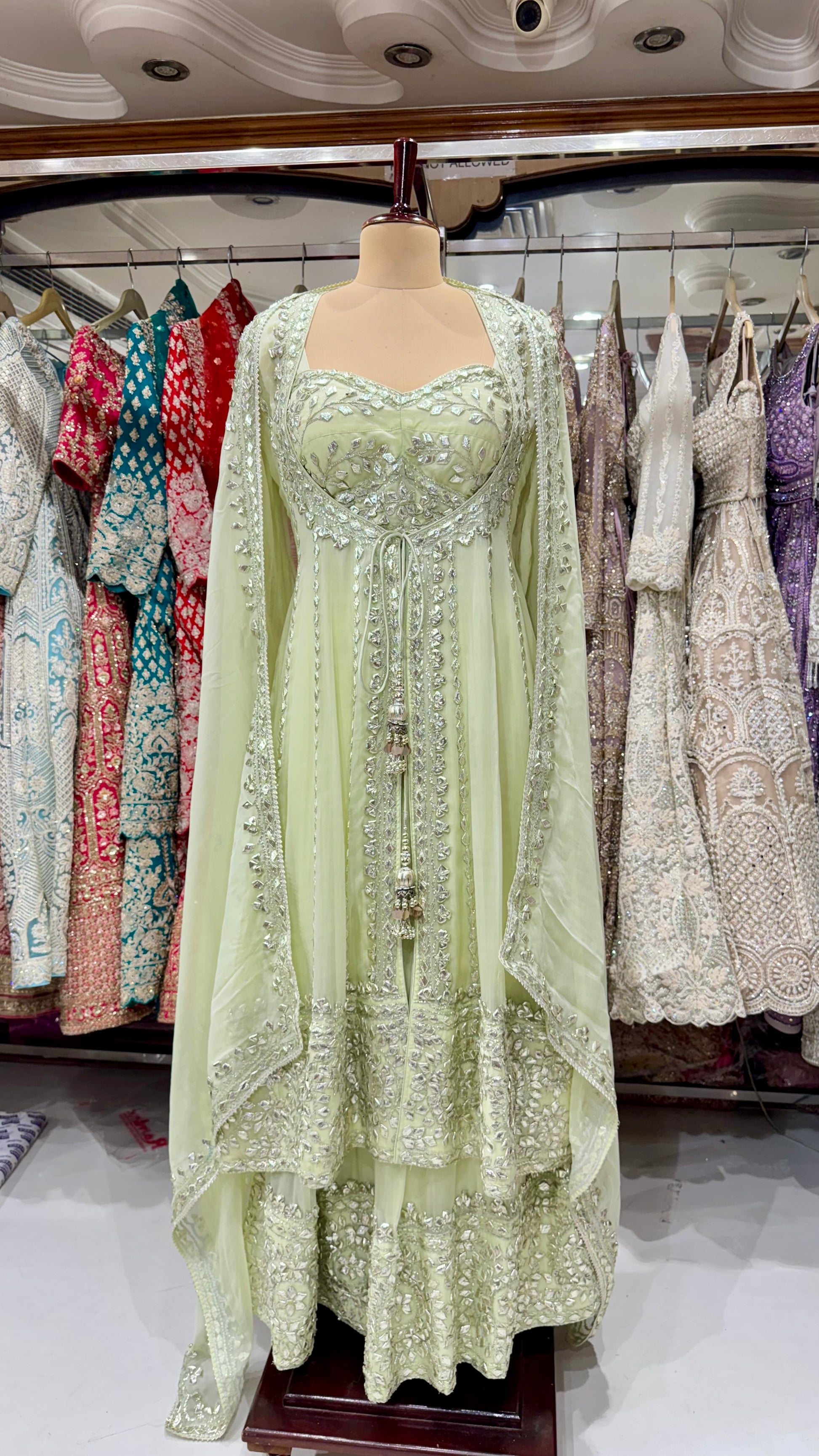 • Fabric: Pure organza choli, lehenga, anarkali cape jacket, and dupatta.