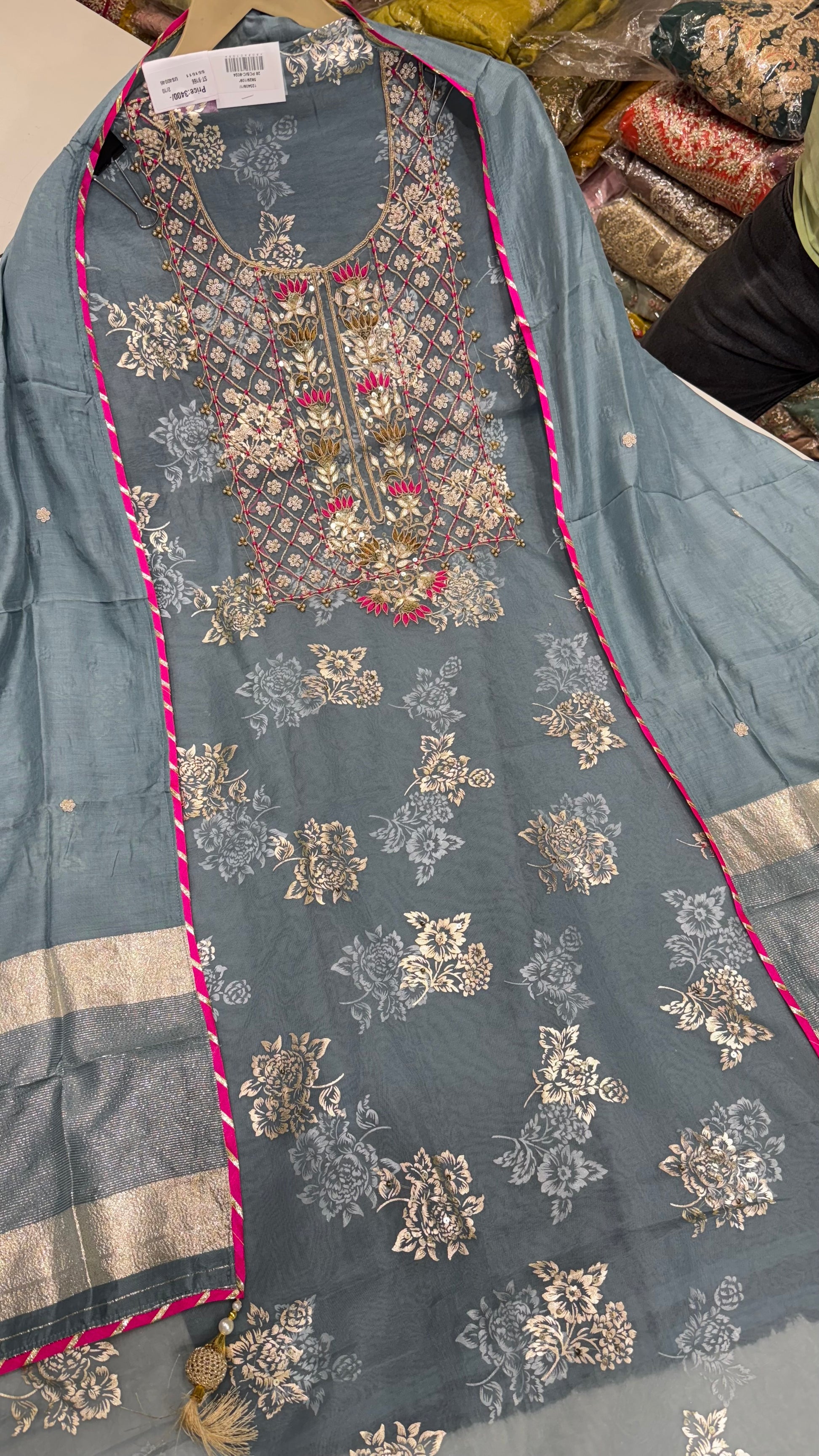 Designer Pure Organza Hand-Embroidered Unstitched Suit with Muslin Dupatta
