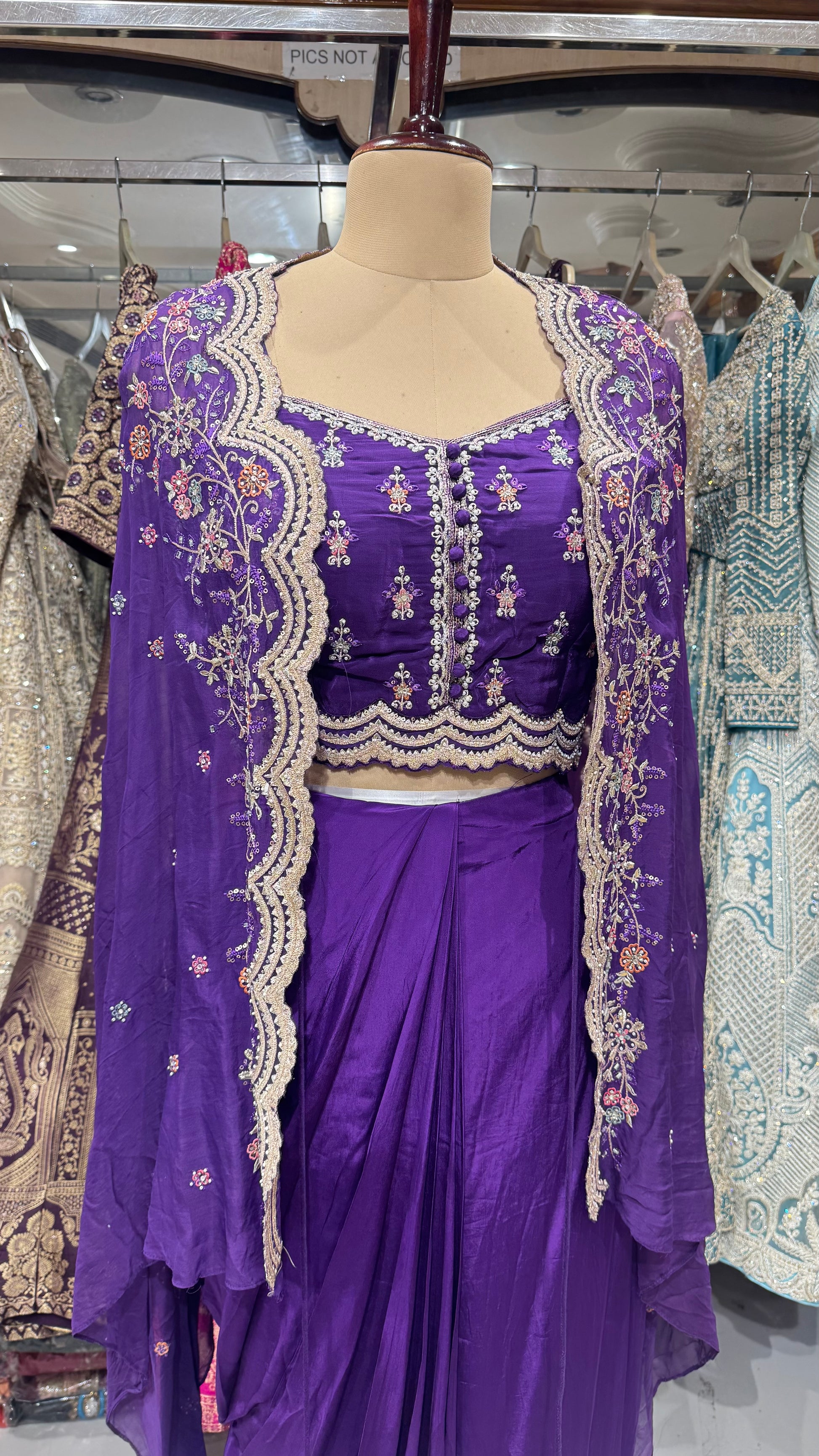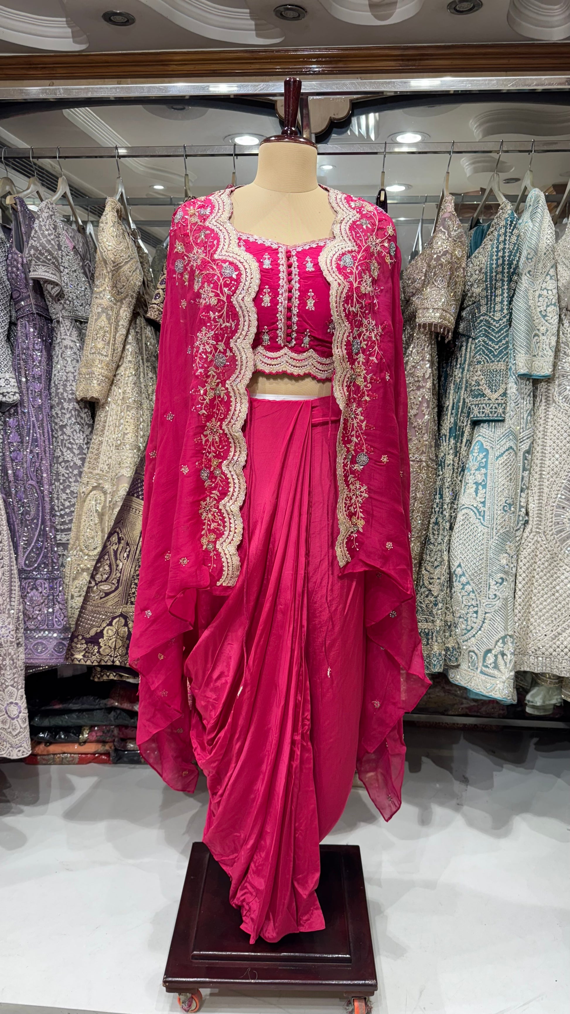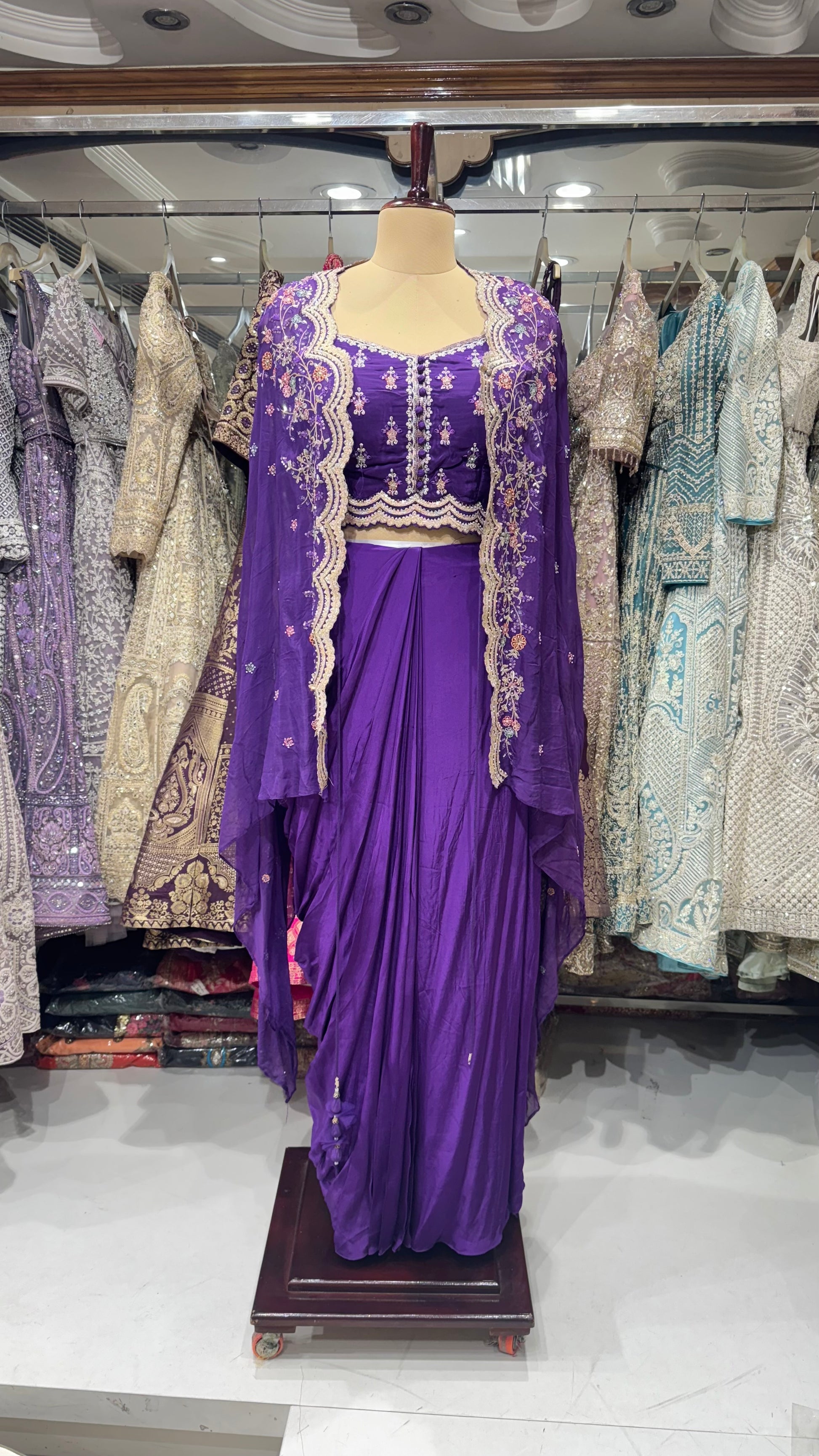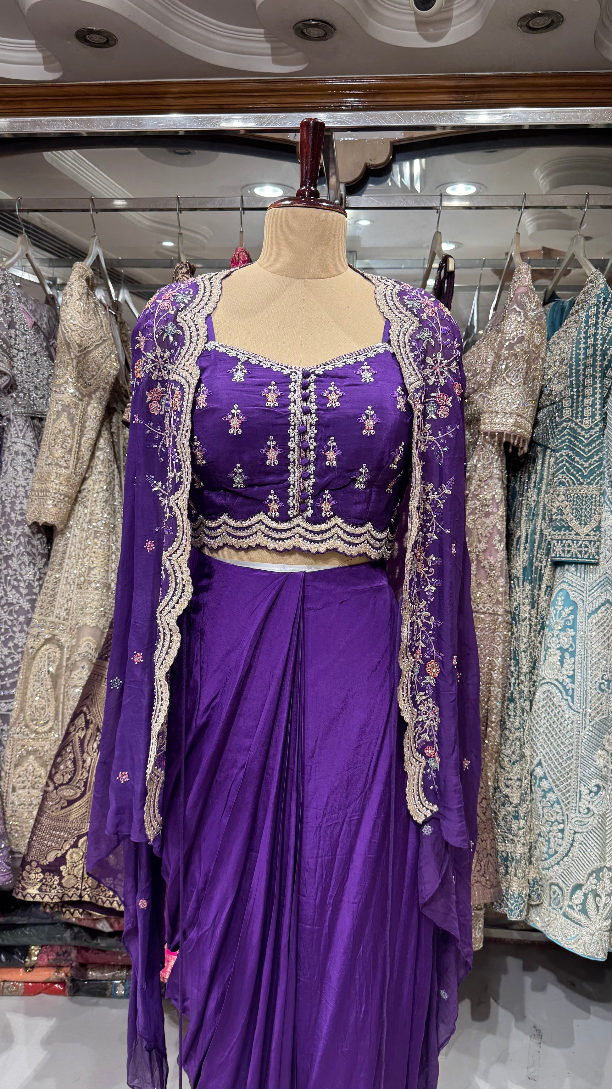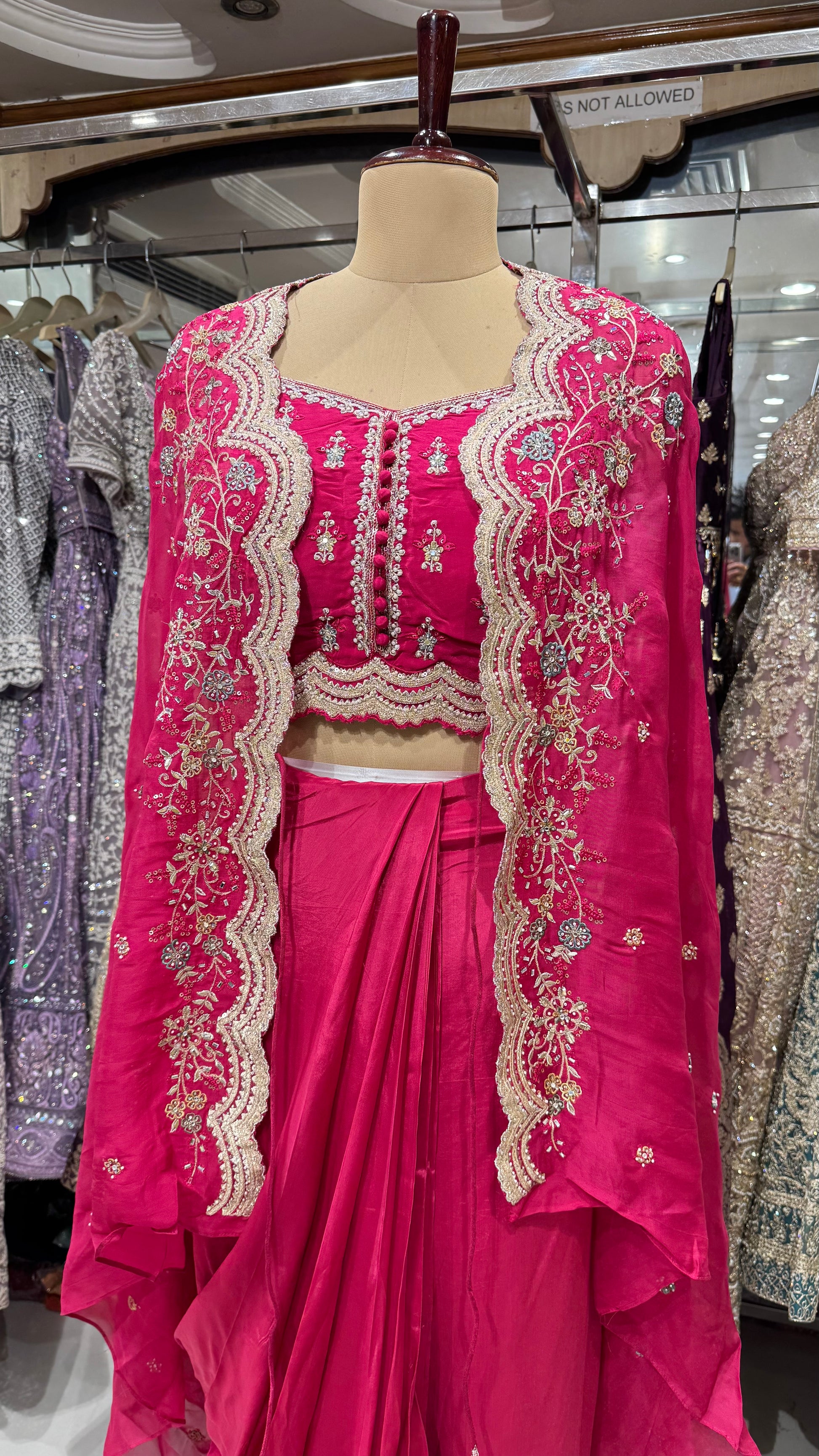 Elegant 3-Piece Indo-Western Ensemble with Embroidered Organza Cape, Pleated Crepe Skirt & Choli