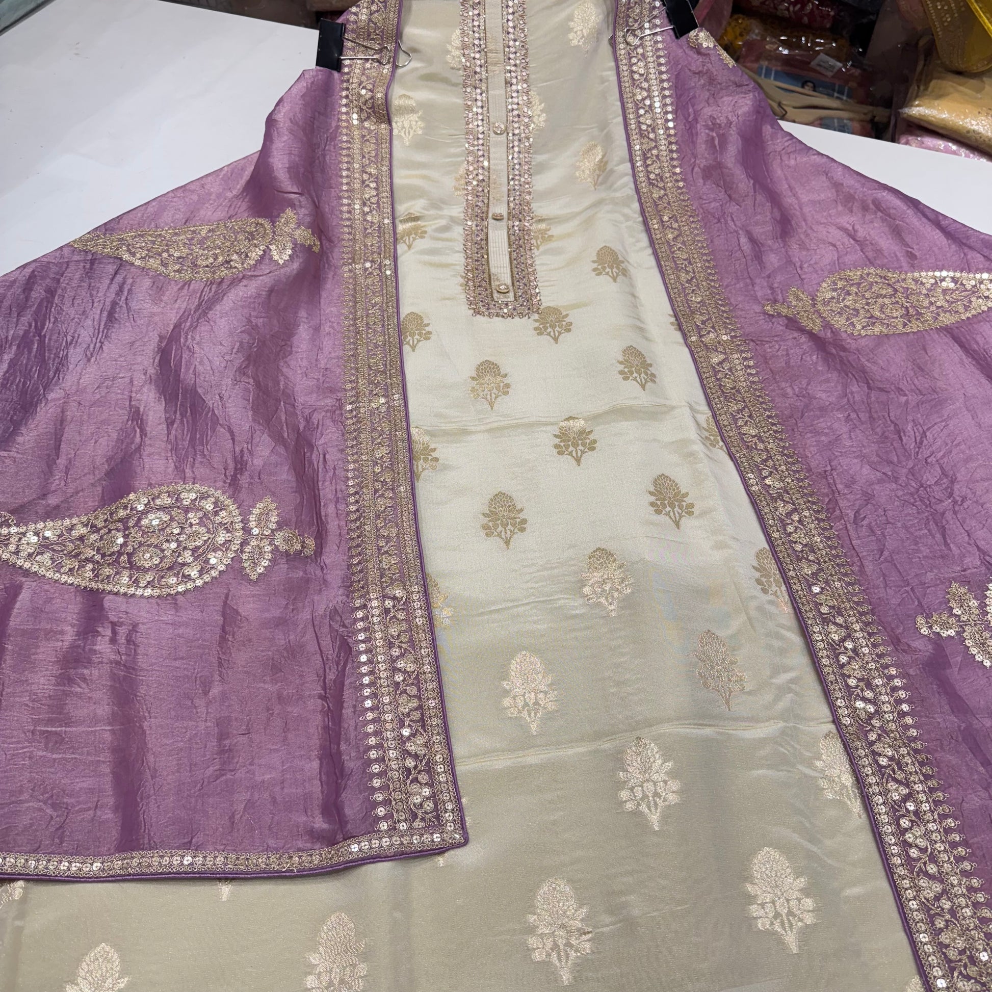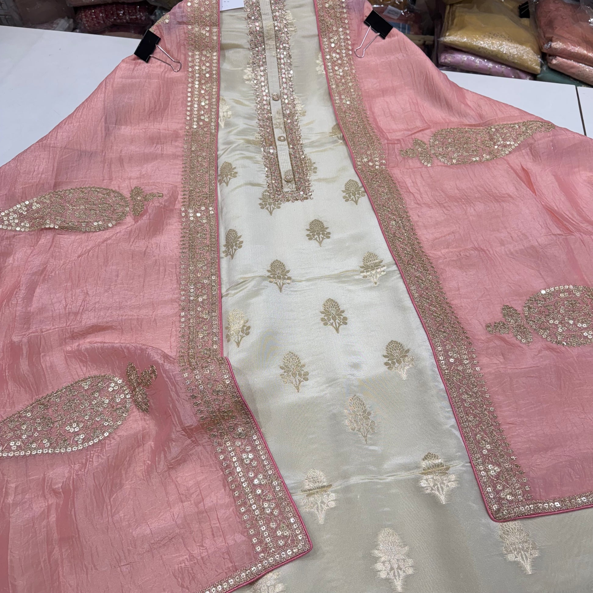 Elegant Banarasi Tissue Suit with Hand-Embroidered Neckline & Sequin Paper Silk Dupatta