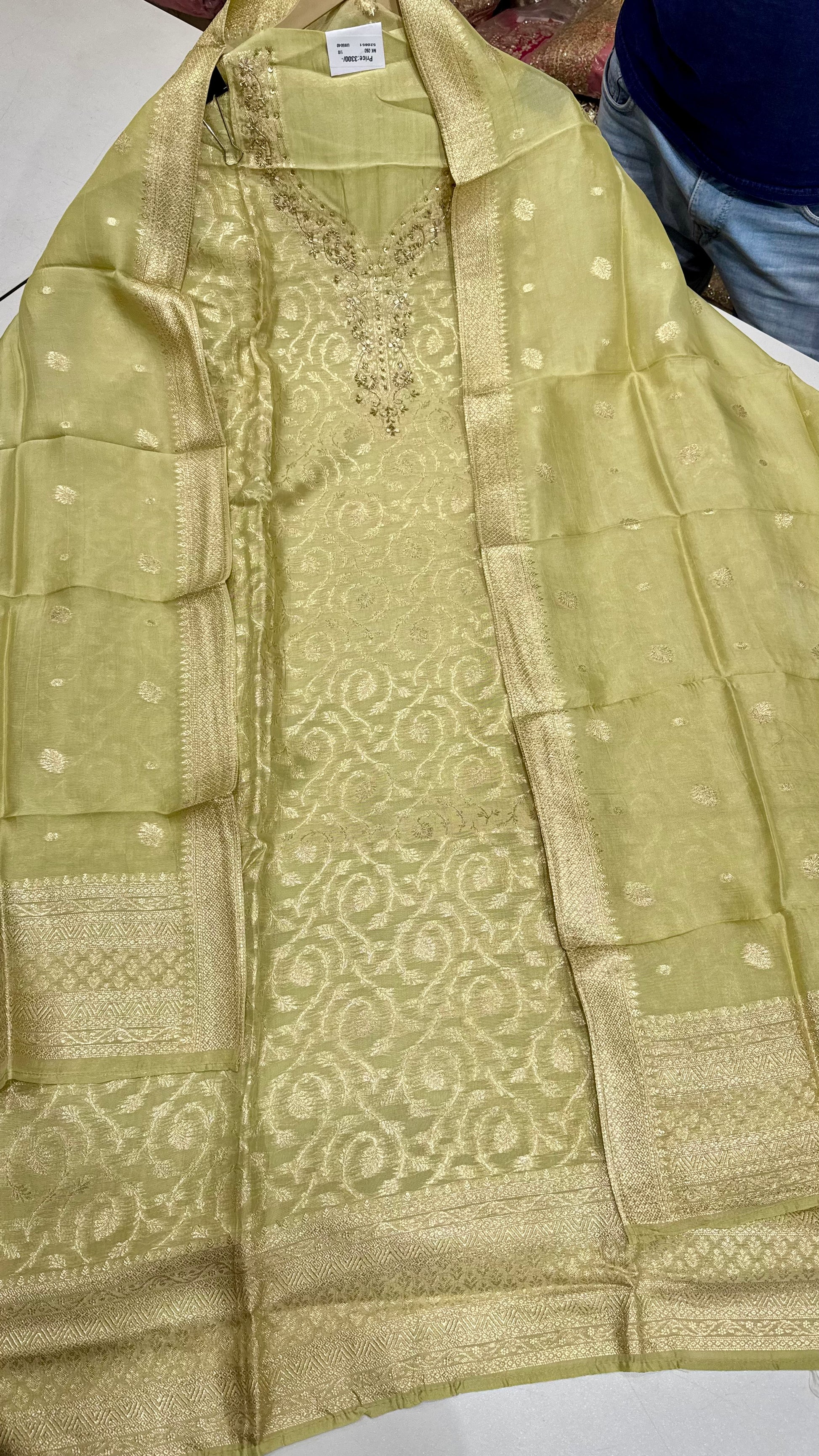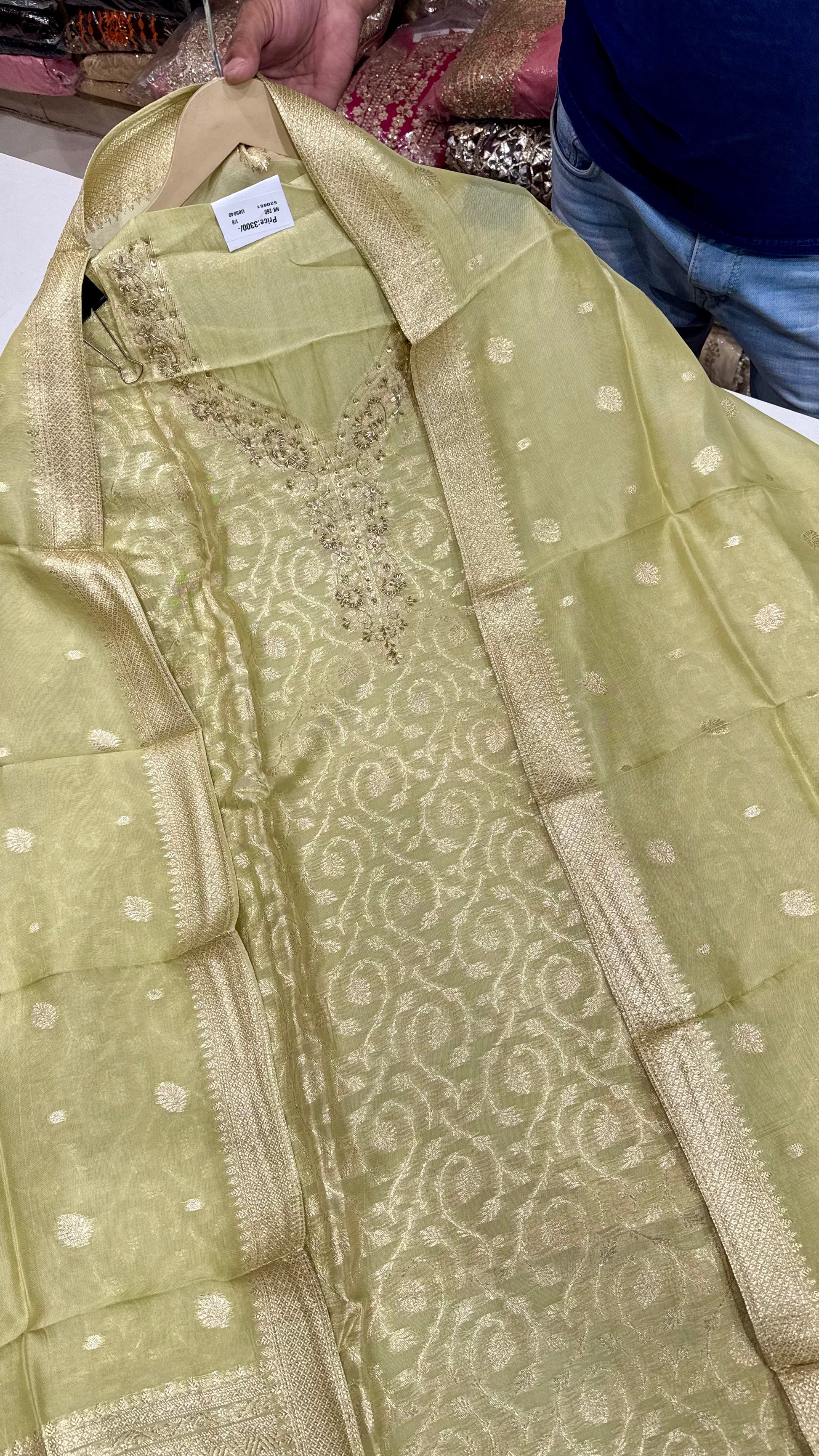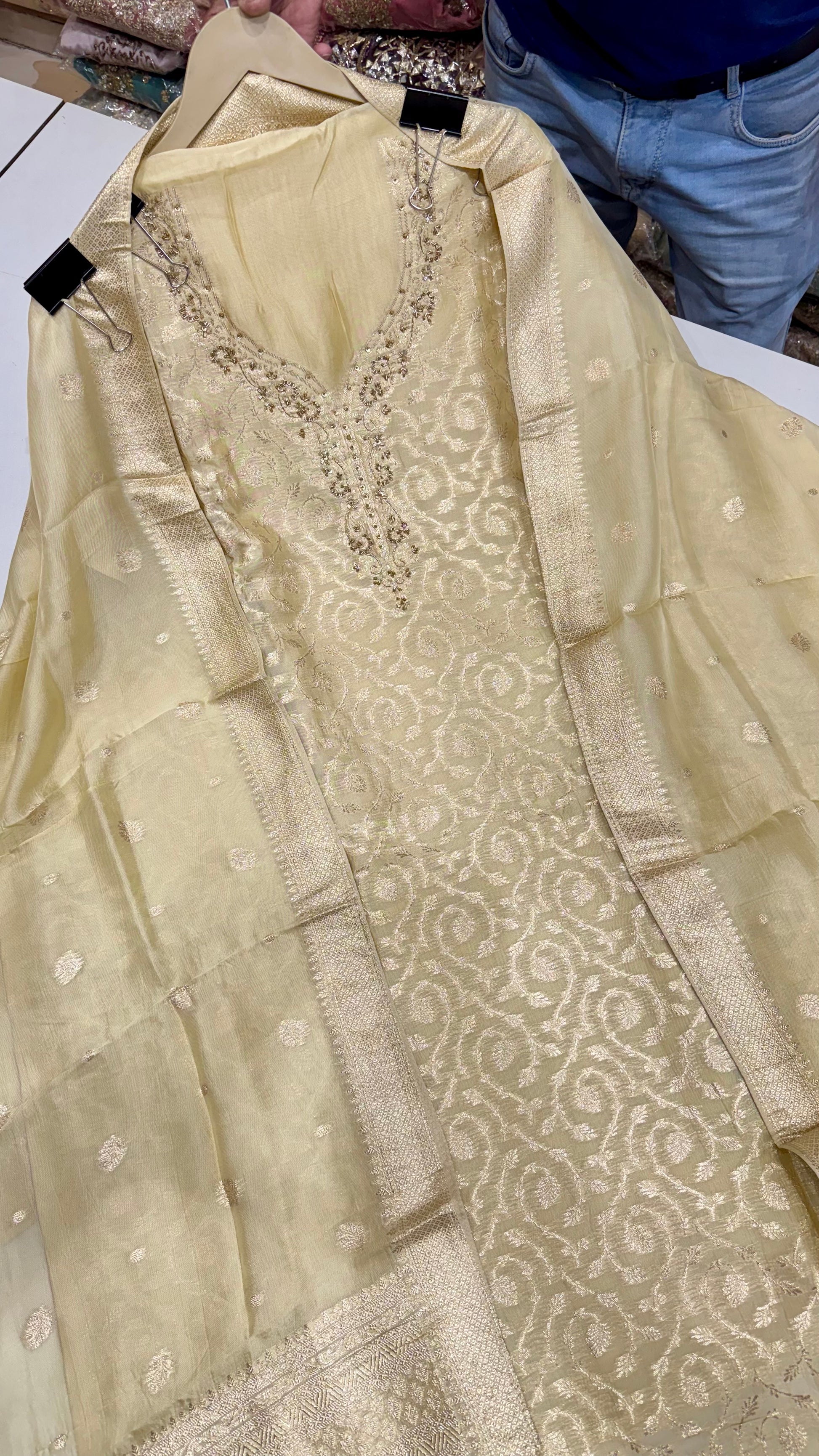 Elegant Banarasi Tissue Unstitched Suit with Dabka Handwork