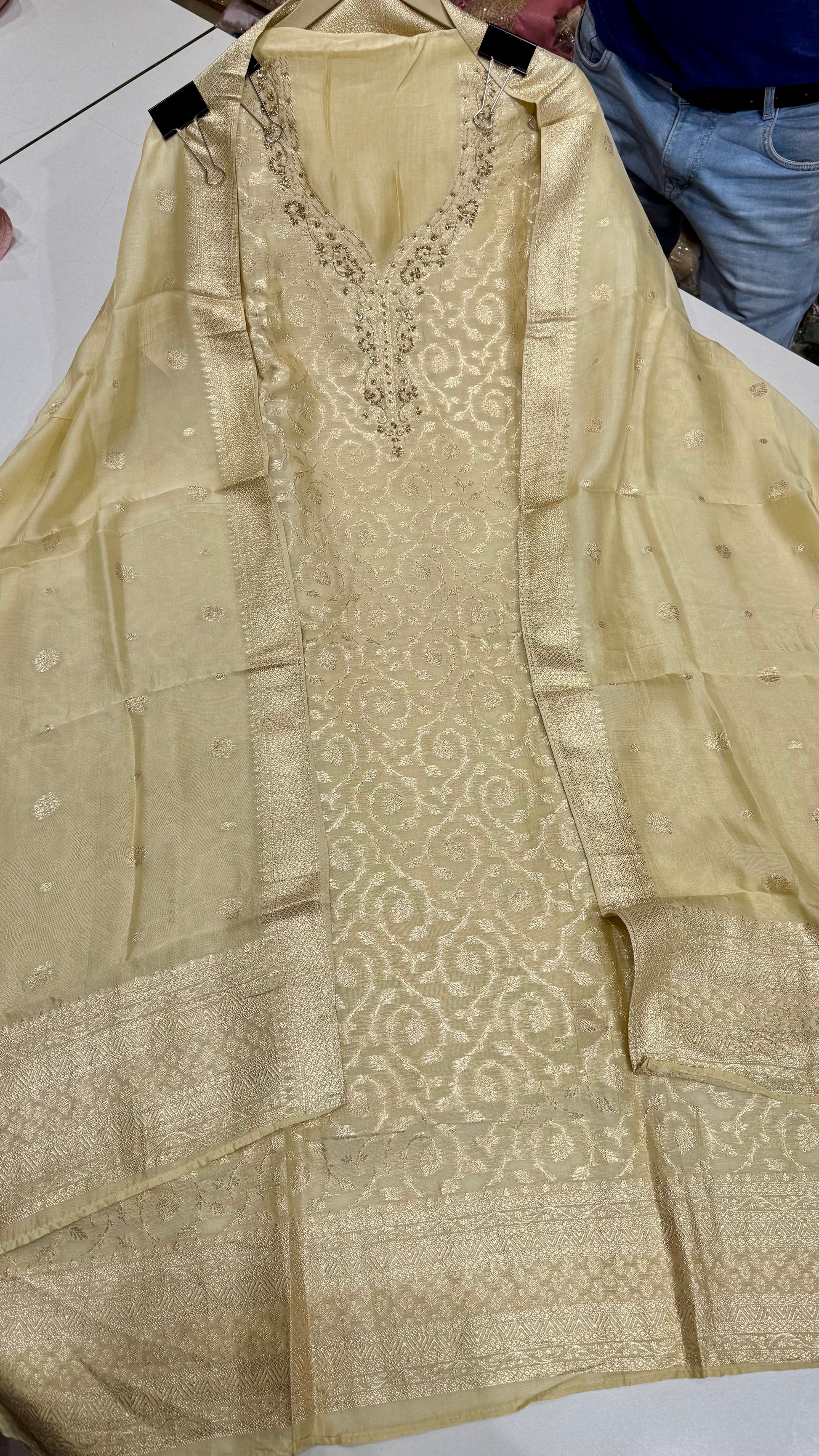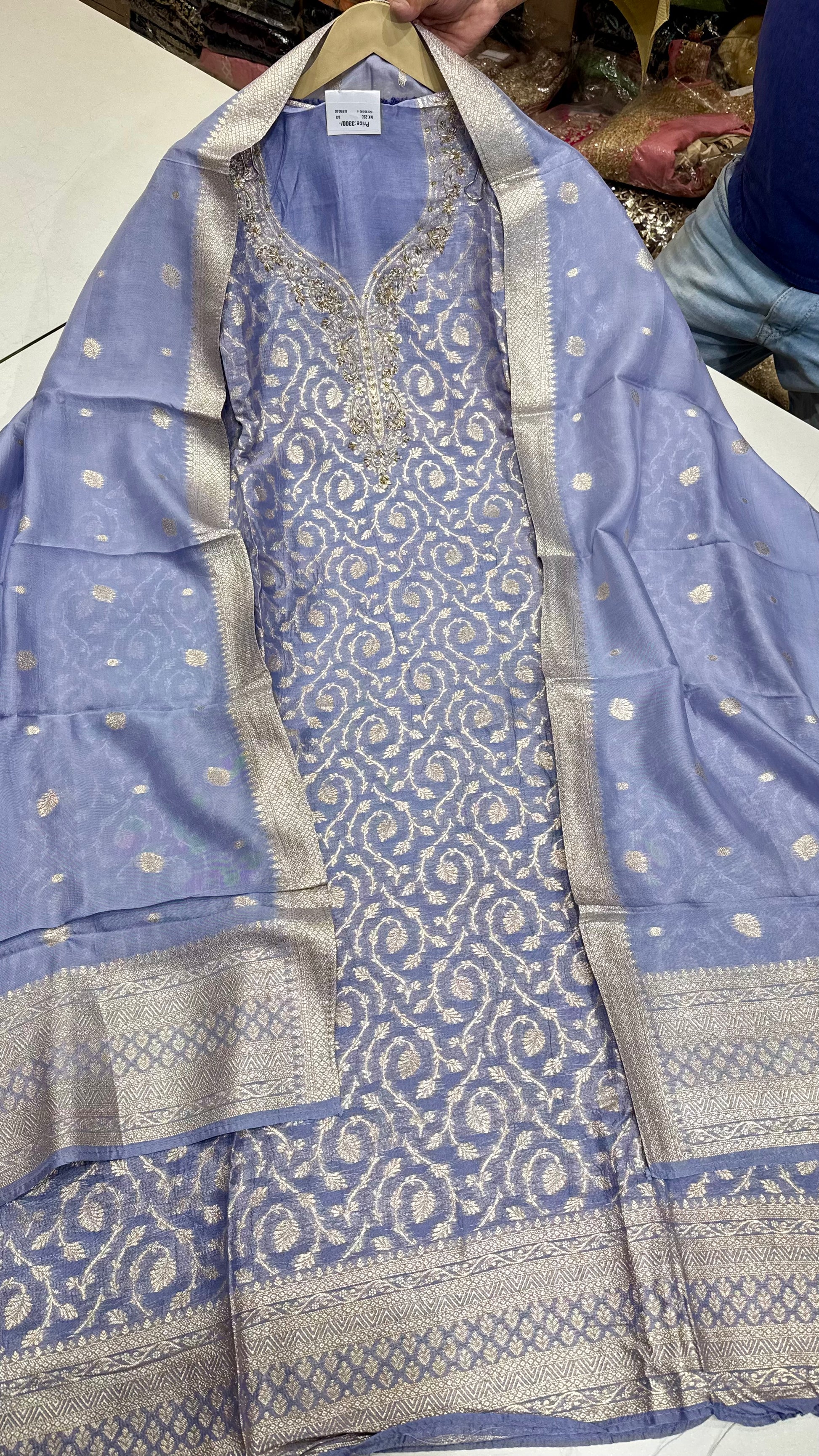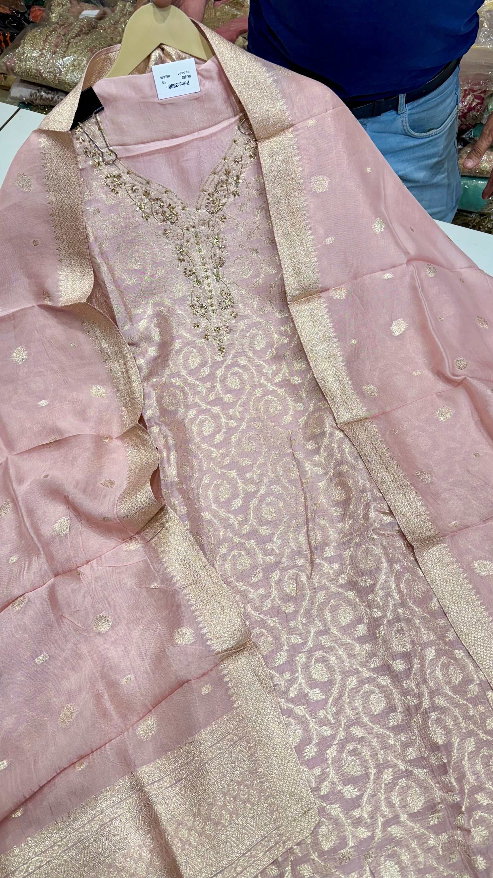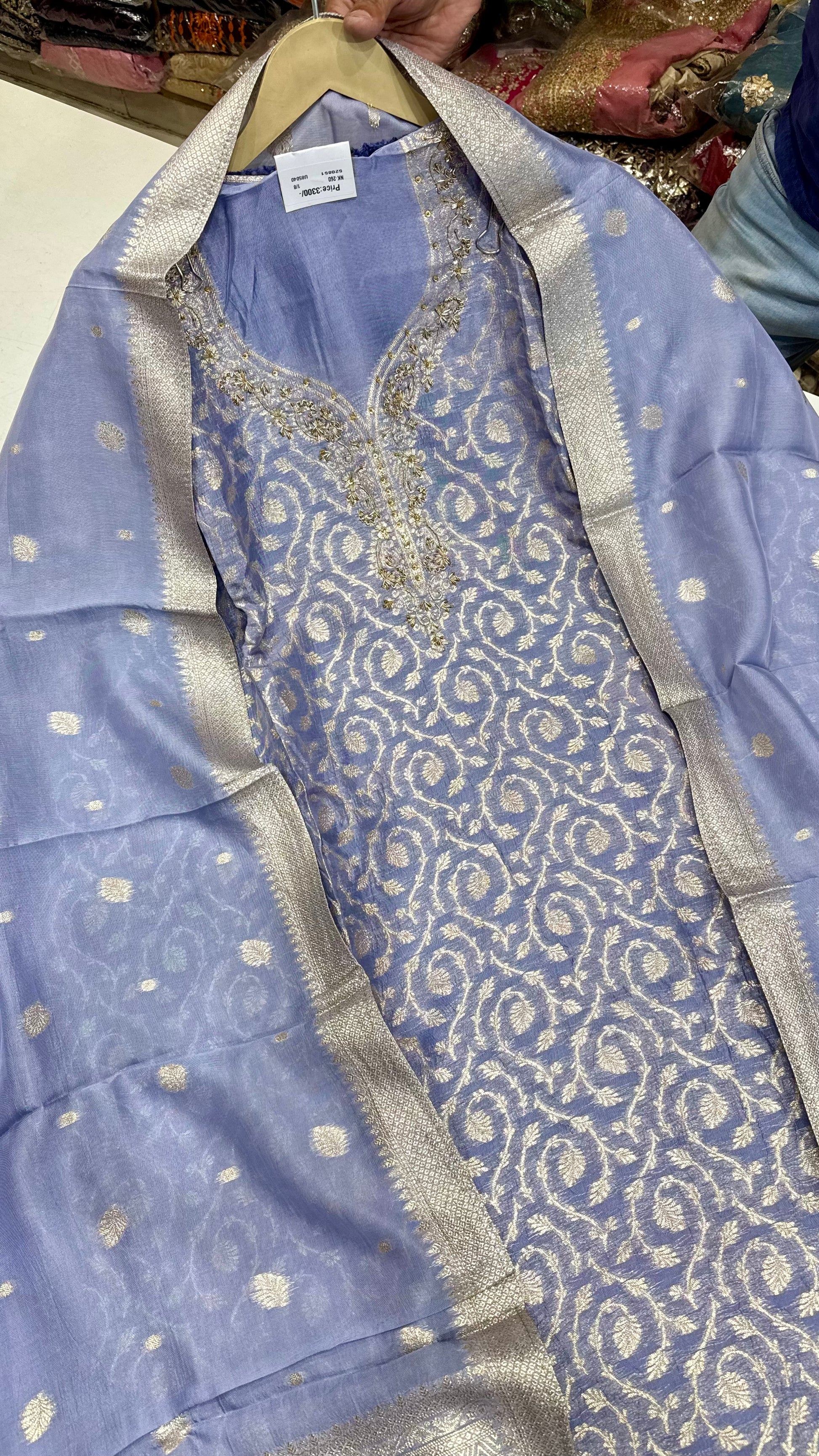 Elegant Banarasi Tissue Unstitched Suit with Dabka Handwork