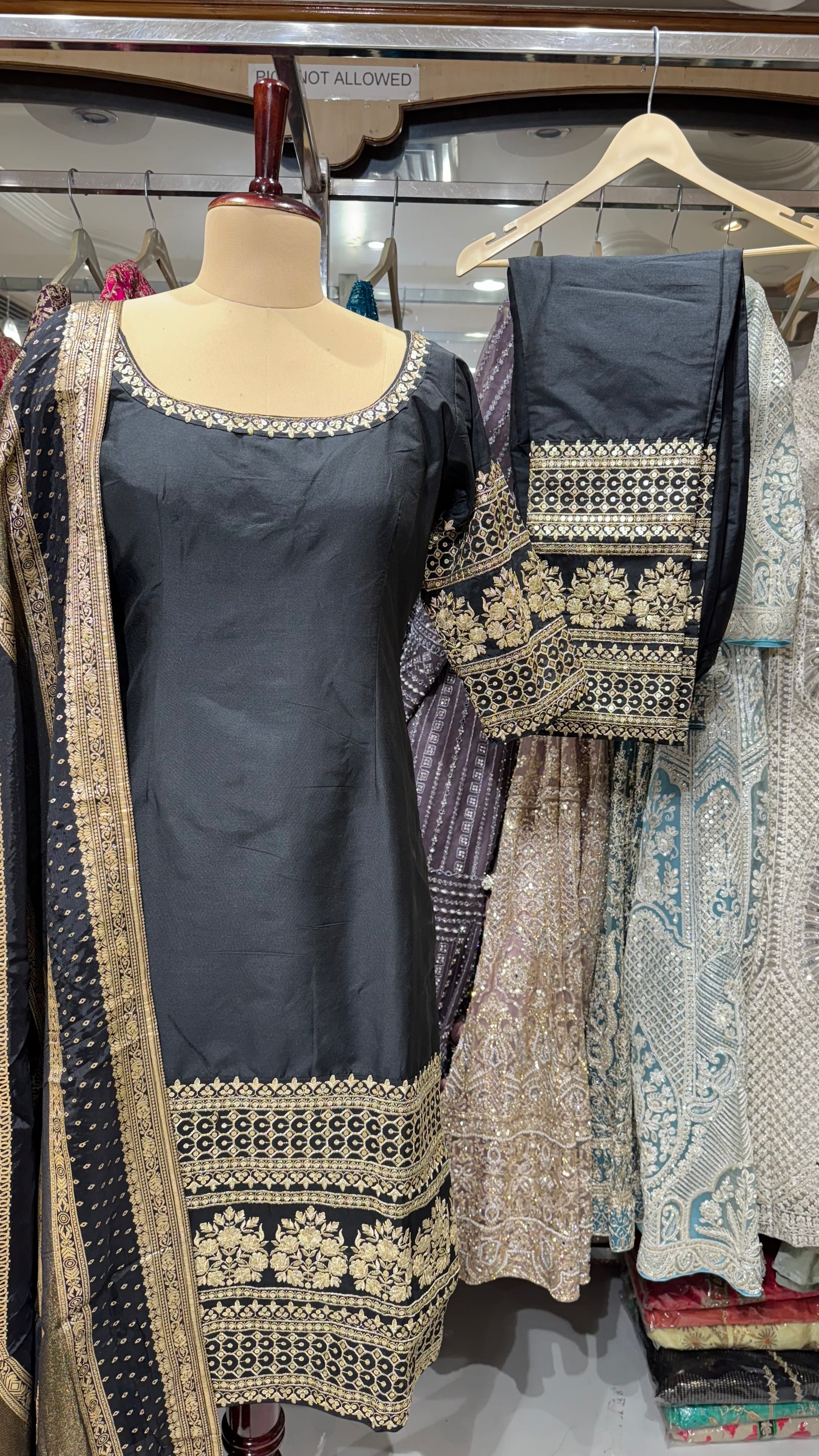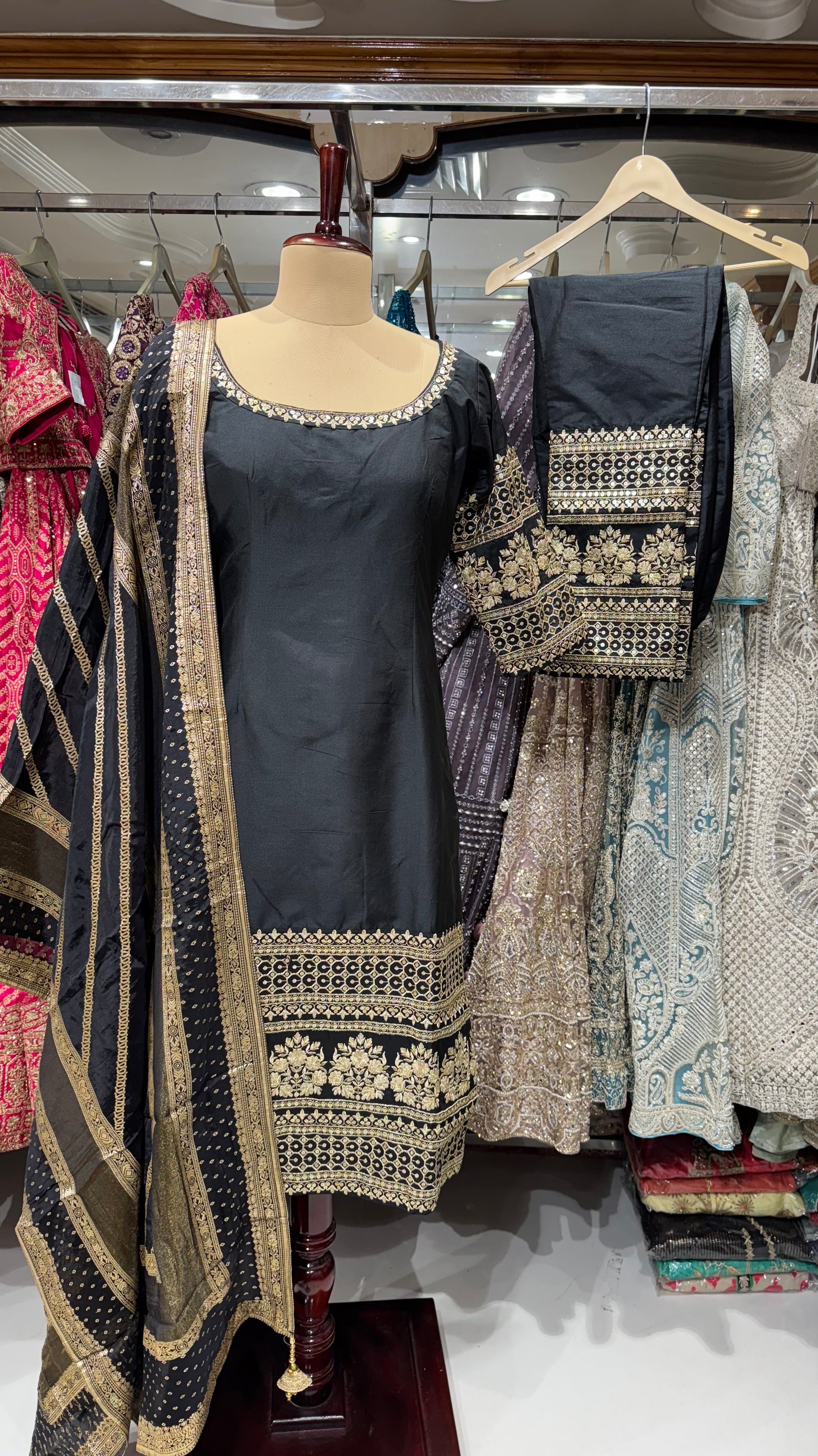 Elegant Black Silk Zari Embroidered Suit with Banarasi Dupatta & Silk Embroidered Pants