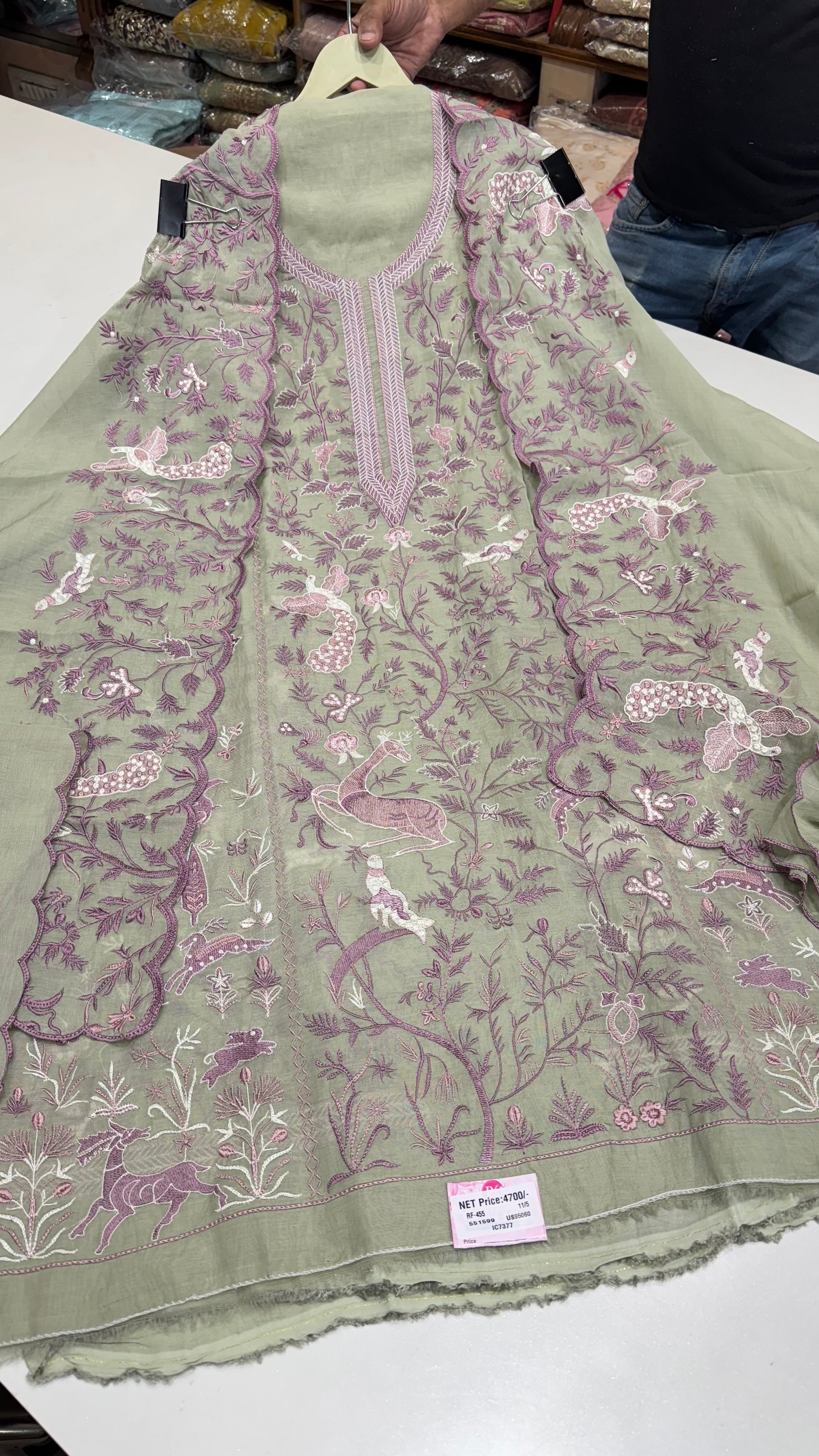 - Work: Intricate thread embroidery with nature-inspired motifs (birds, deer, florals)