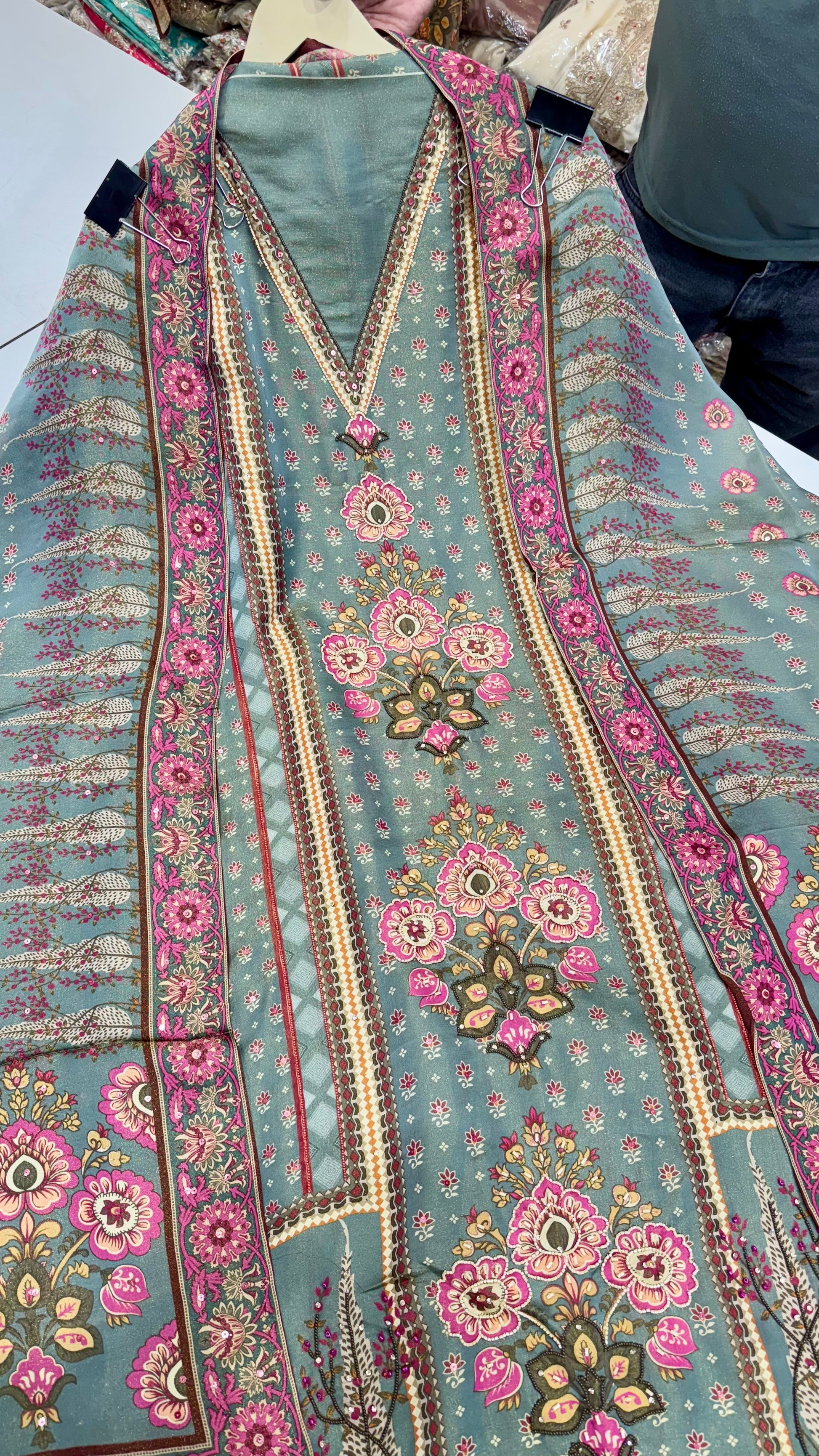 Elegant Satin Silk Unstitched Suit with Printed Dupatta & Hand-Embroidered Pearl Work