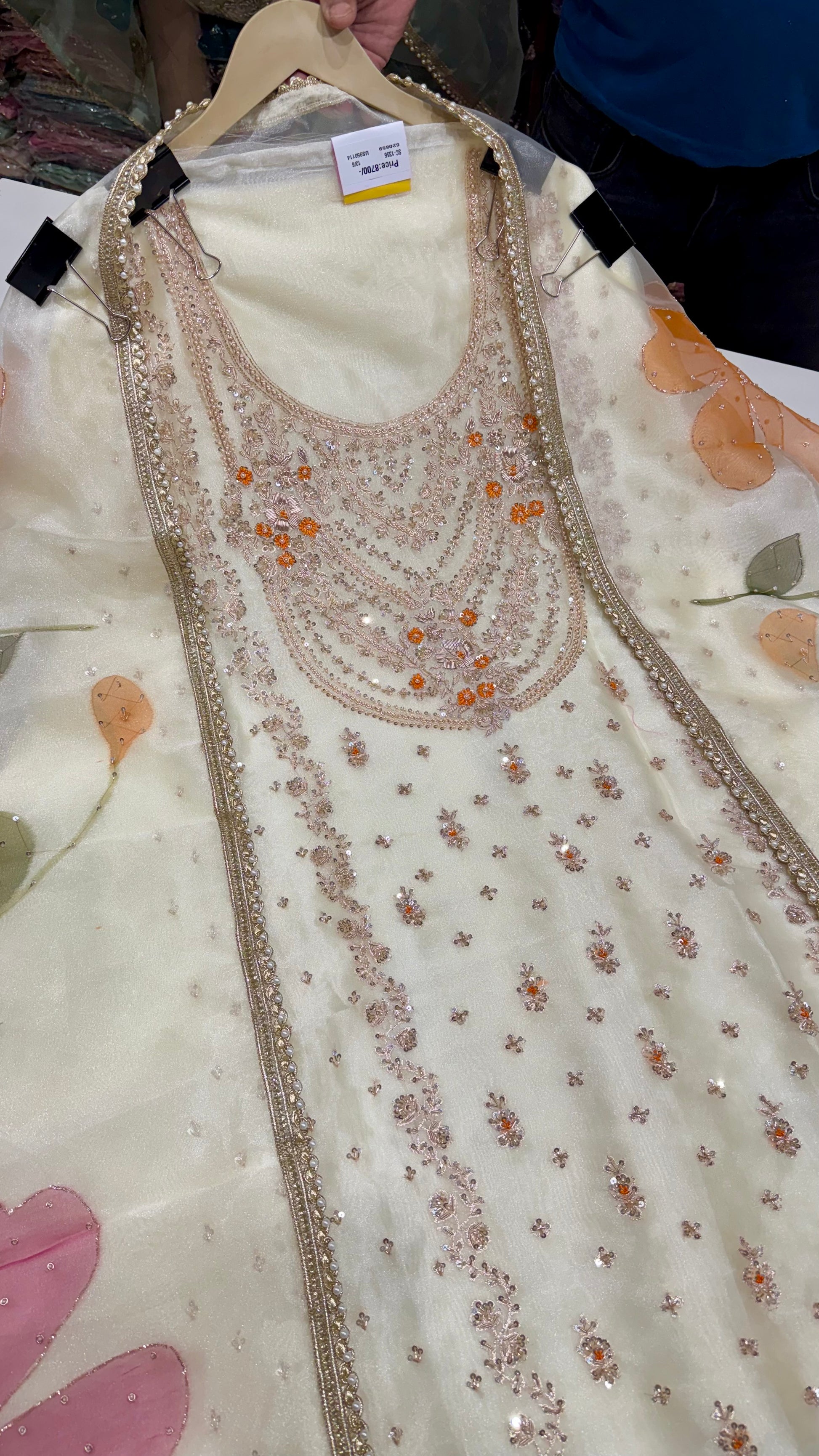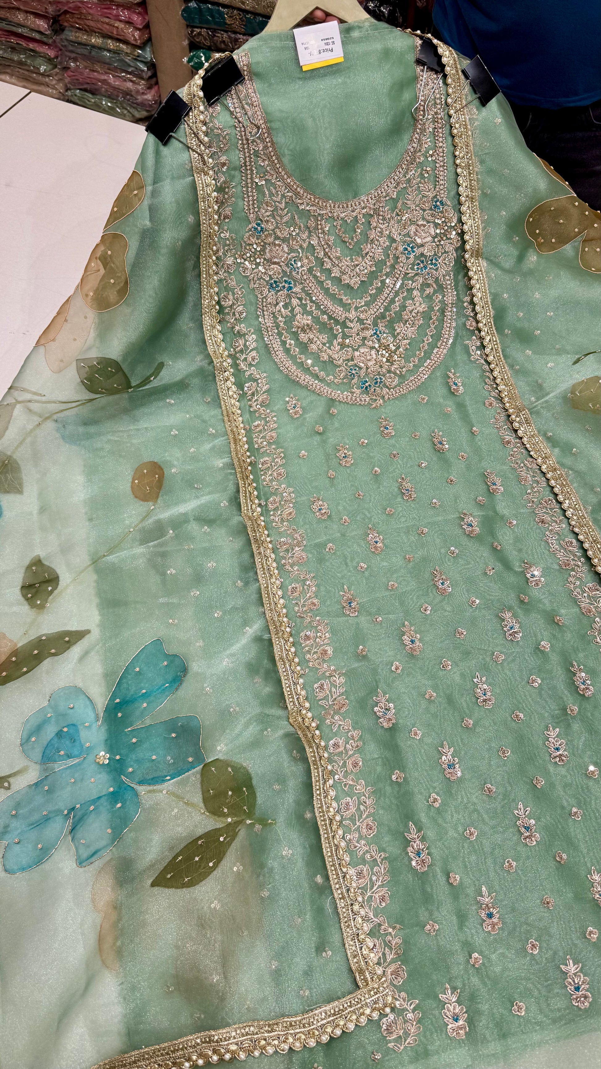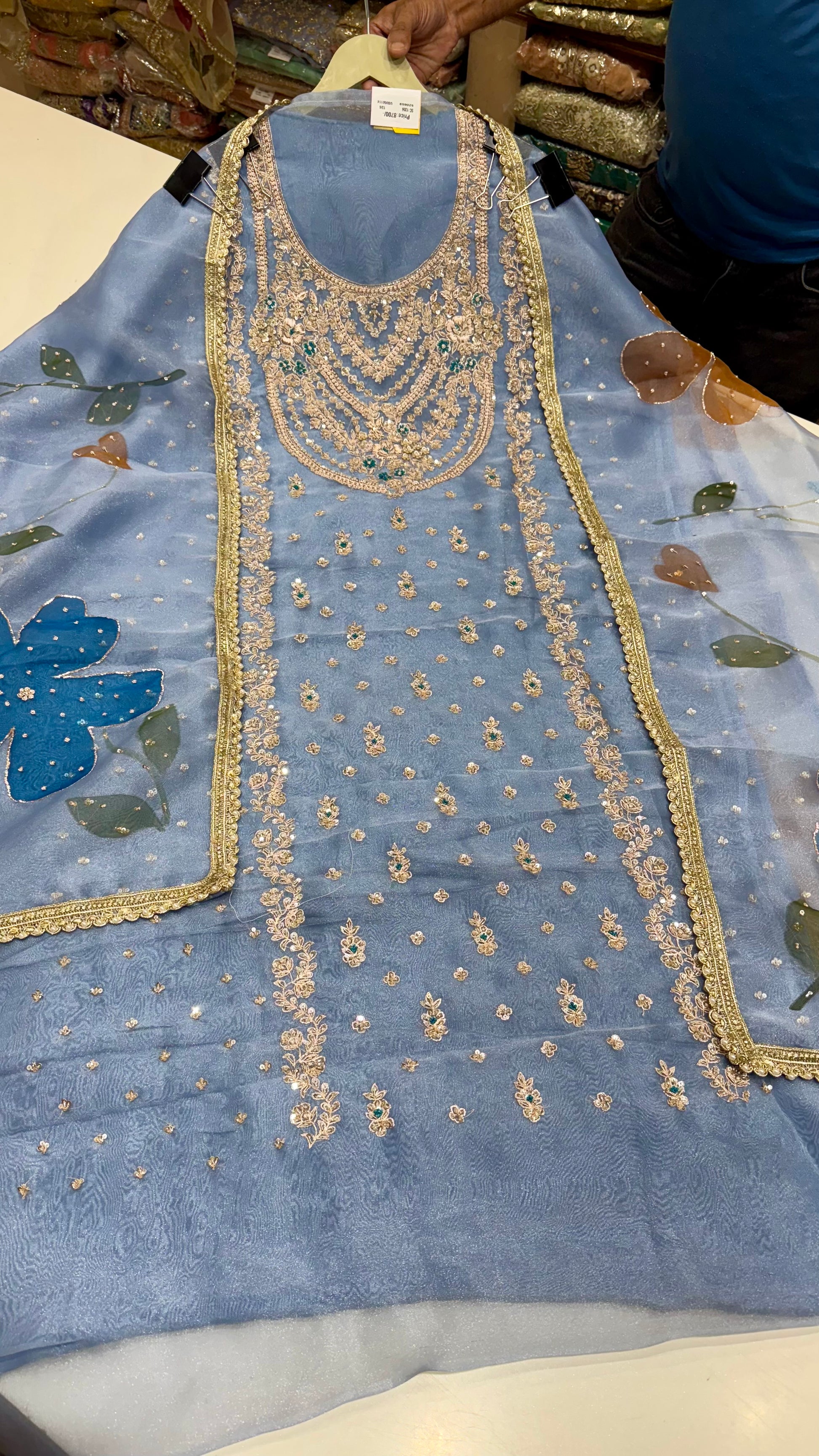 - Shirt Fabric: Pure Glass Organza with intricate hand-embroidered Zardozi & Dabka work on neckline, front panel & sleeves