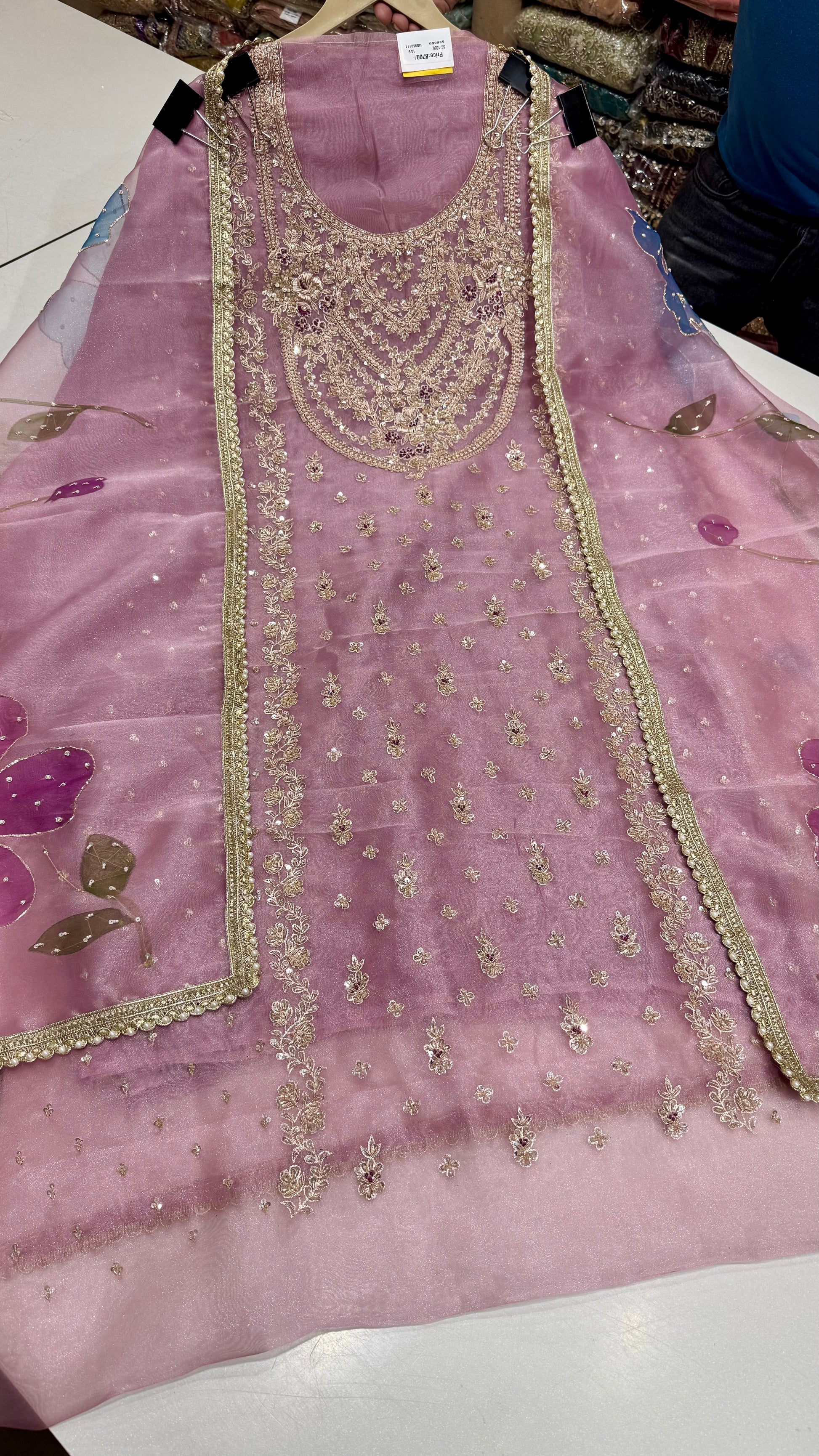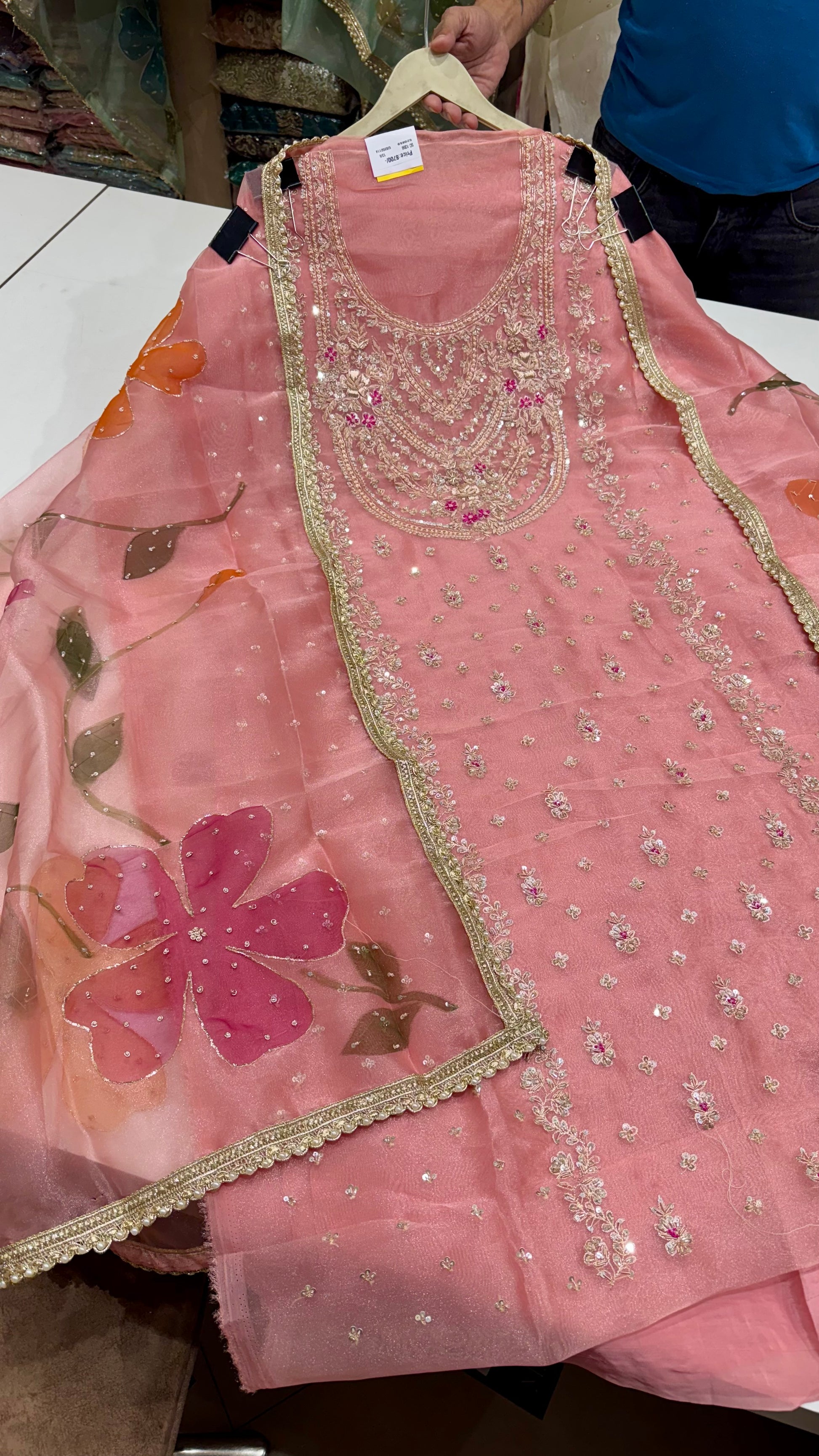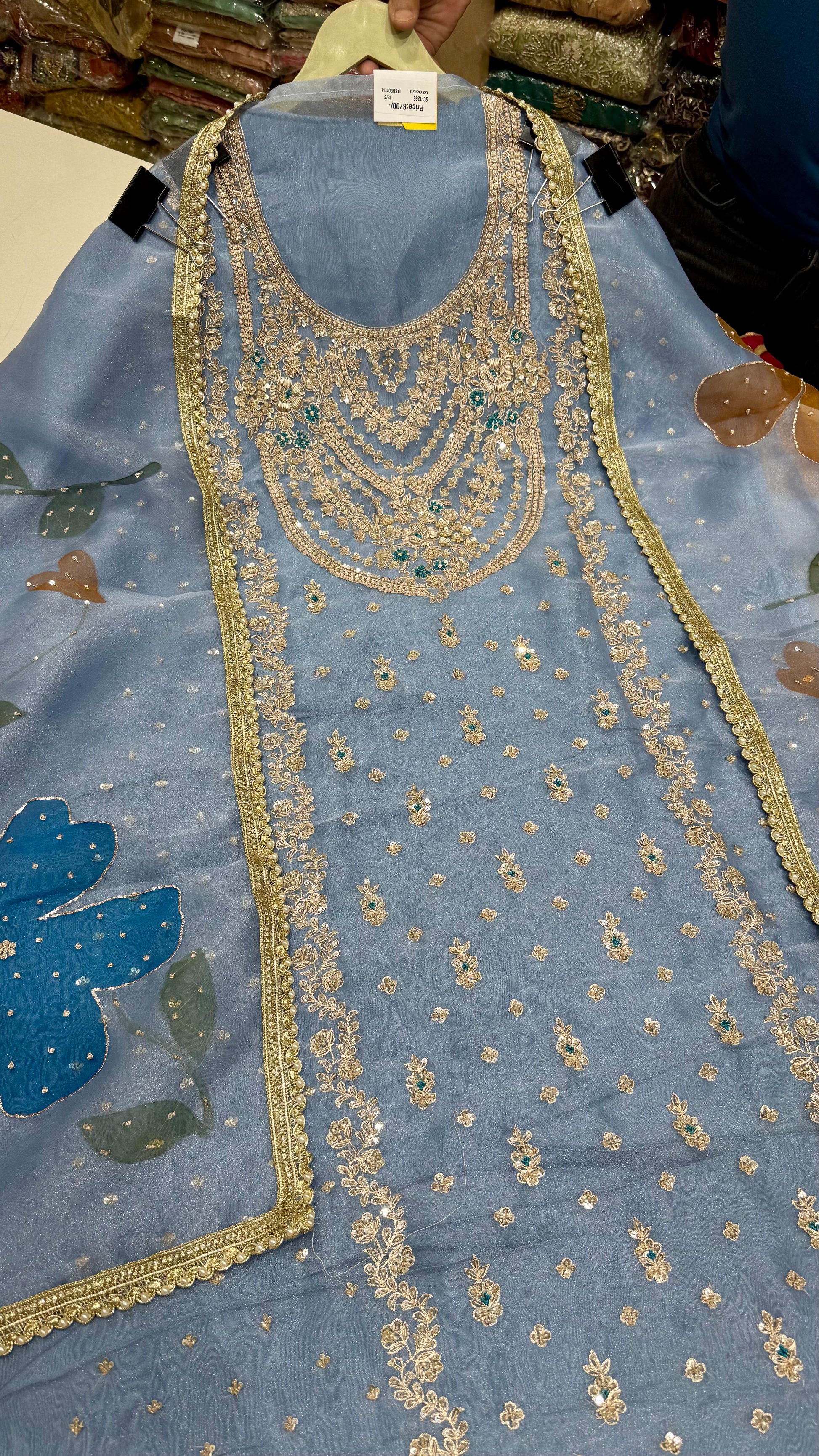 - Shirt Fabric: Pure Glass Organza with intricate hand-embroidered Zardozi & Dabka work on neckline, front panel & sleeves