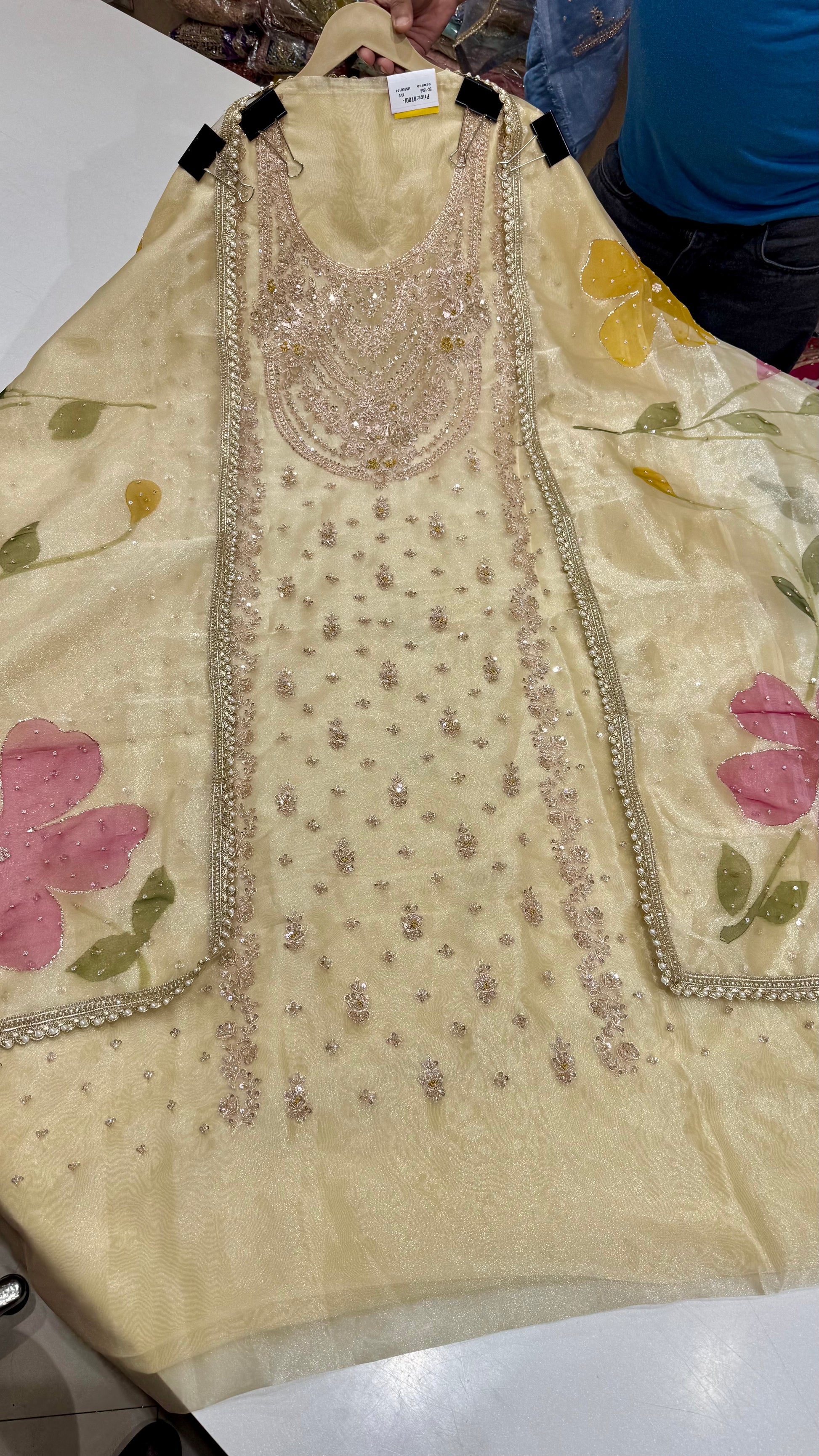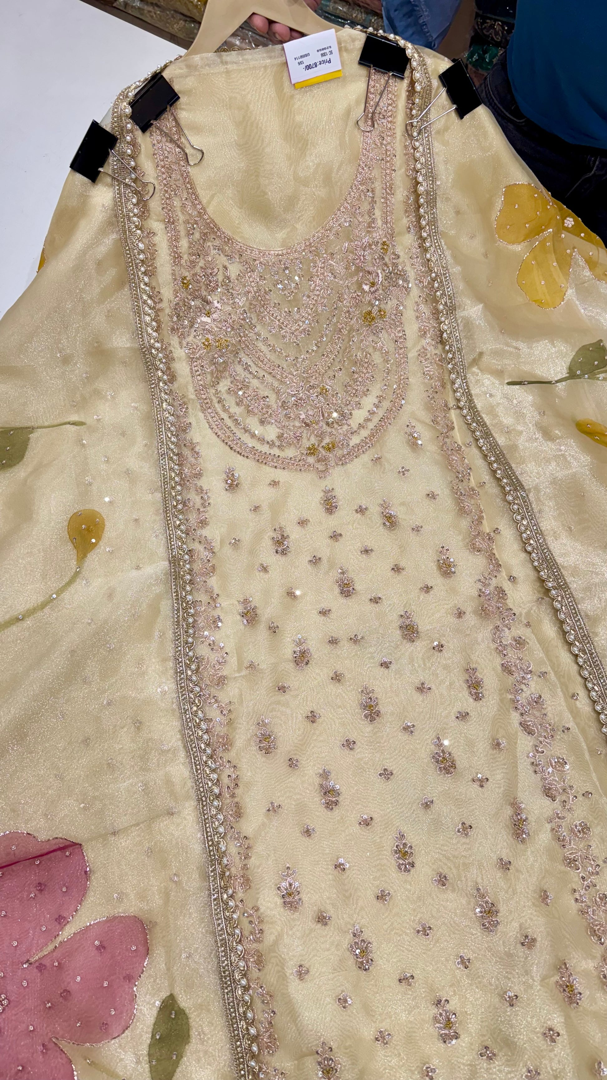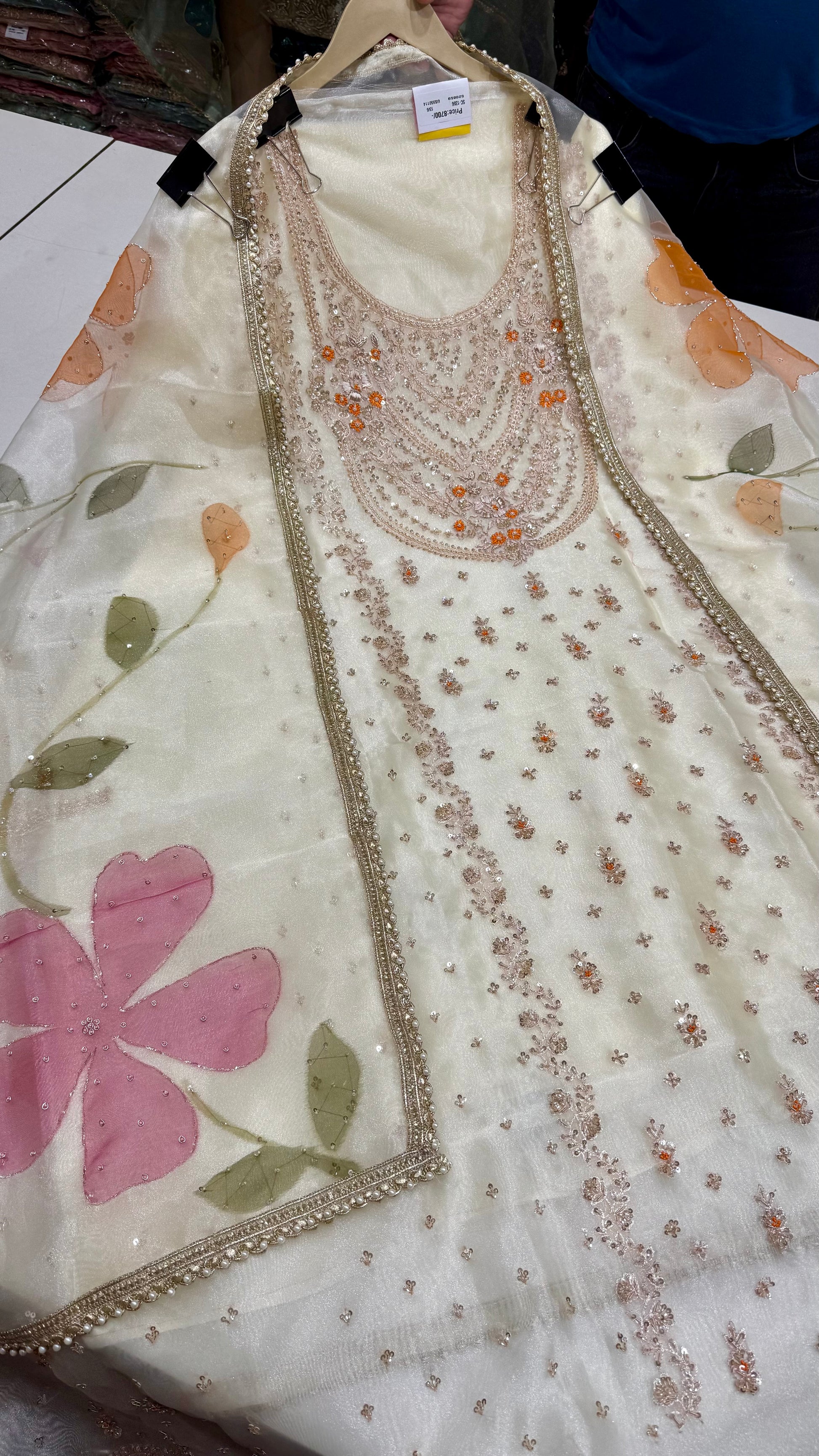 Glass Organza Unstitched Suit with Heavy Zardozi Hand Embroidery