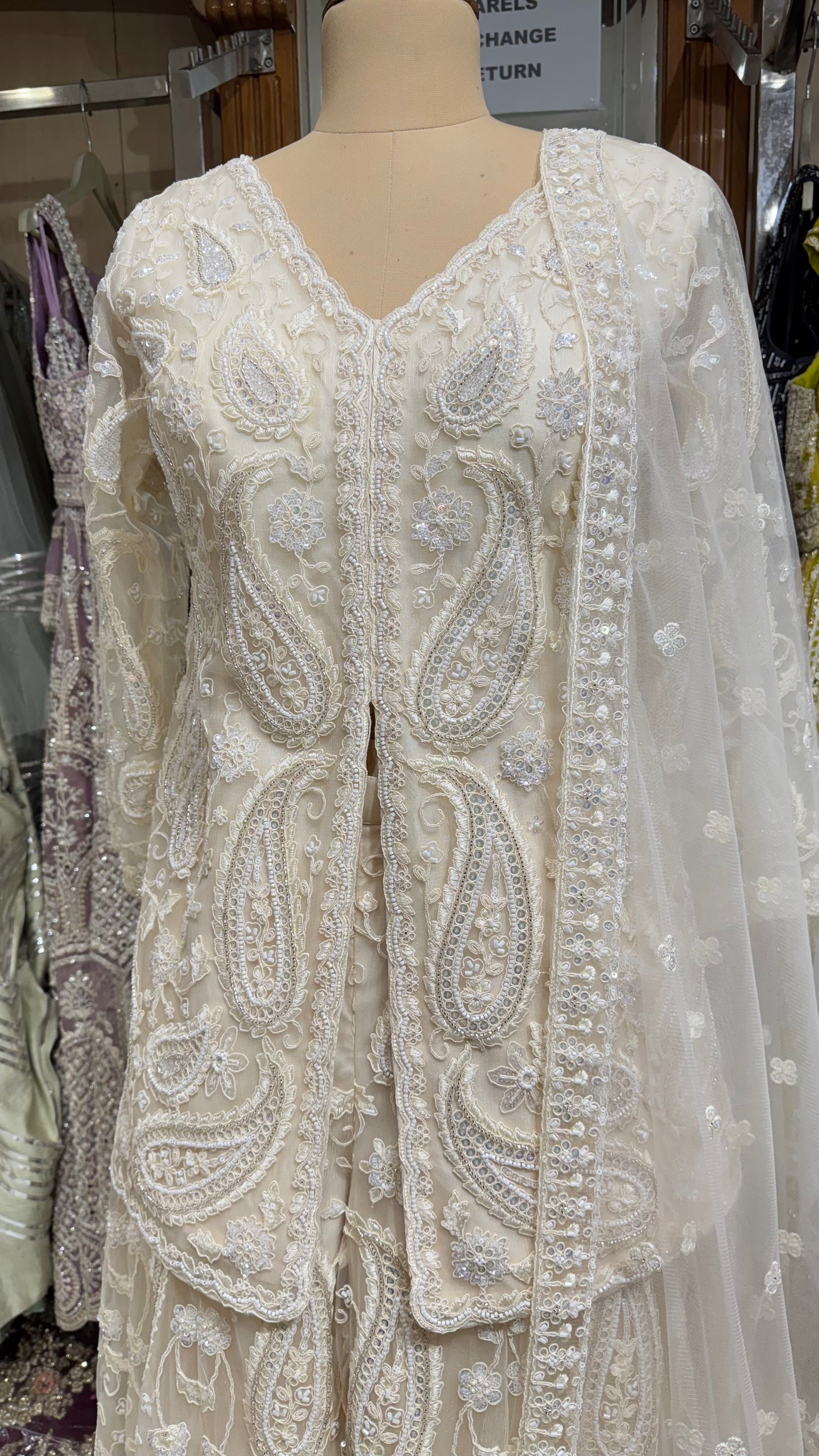 • Dupatta: Elegant net dupatta with detailed handwork and border highlights.
