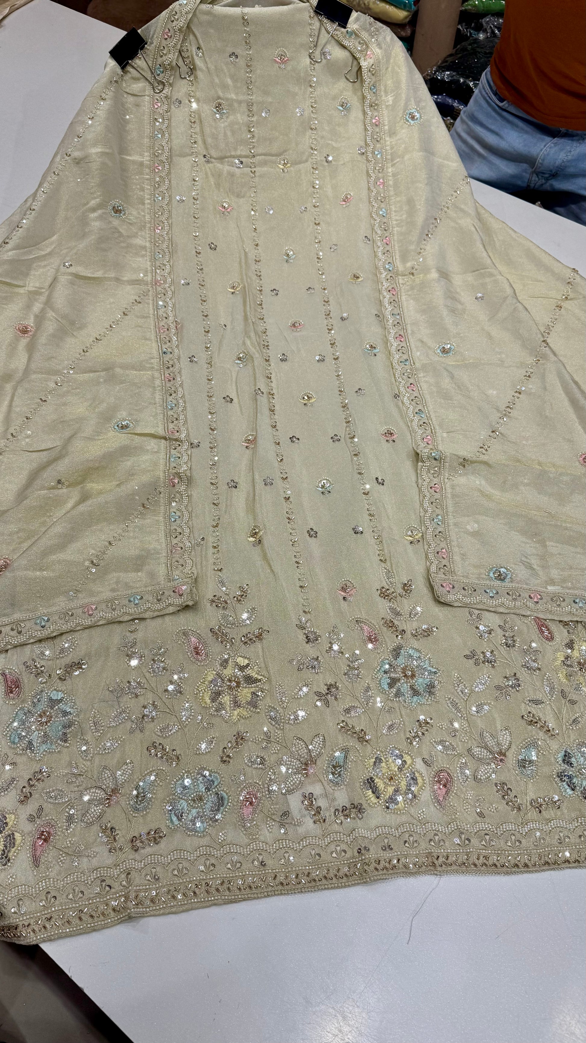 - Shirt Fabric: Premium Tissue with intricate Zardozi, pearls & dabka hand embroidery on full front