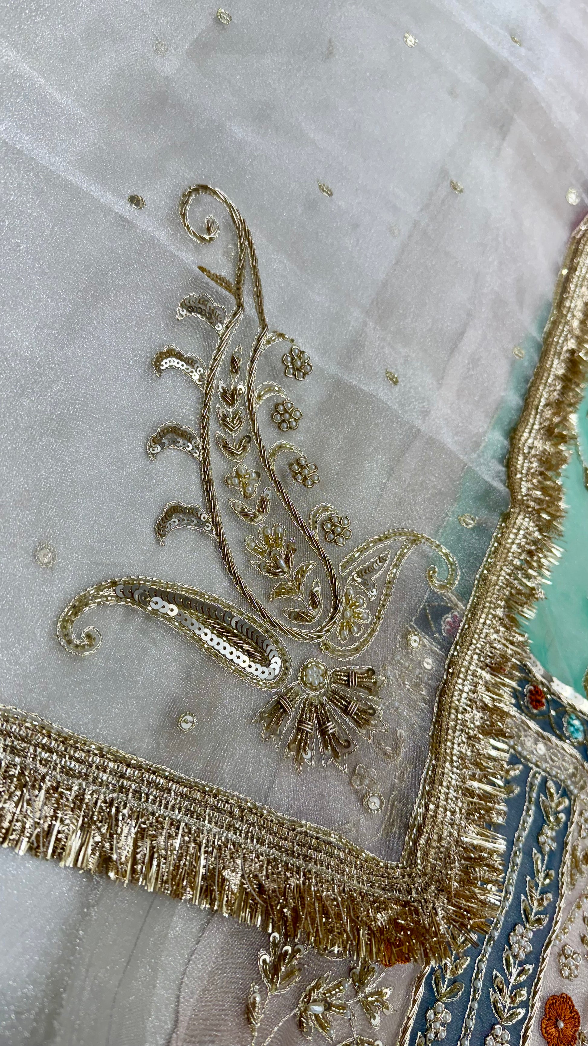 - Intricate hand-embroidered zardozi work on shirt, sleeves & dupatta