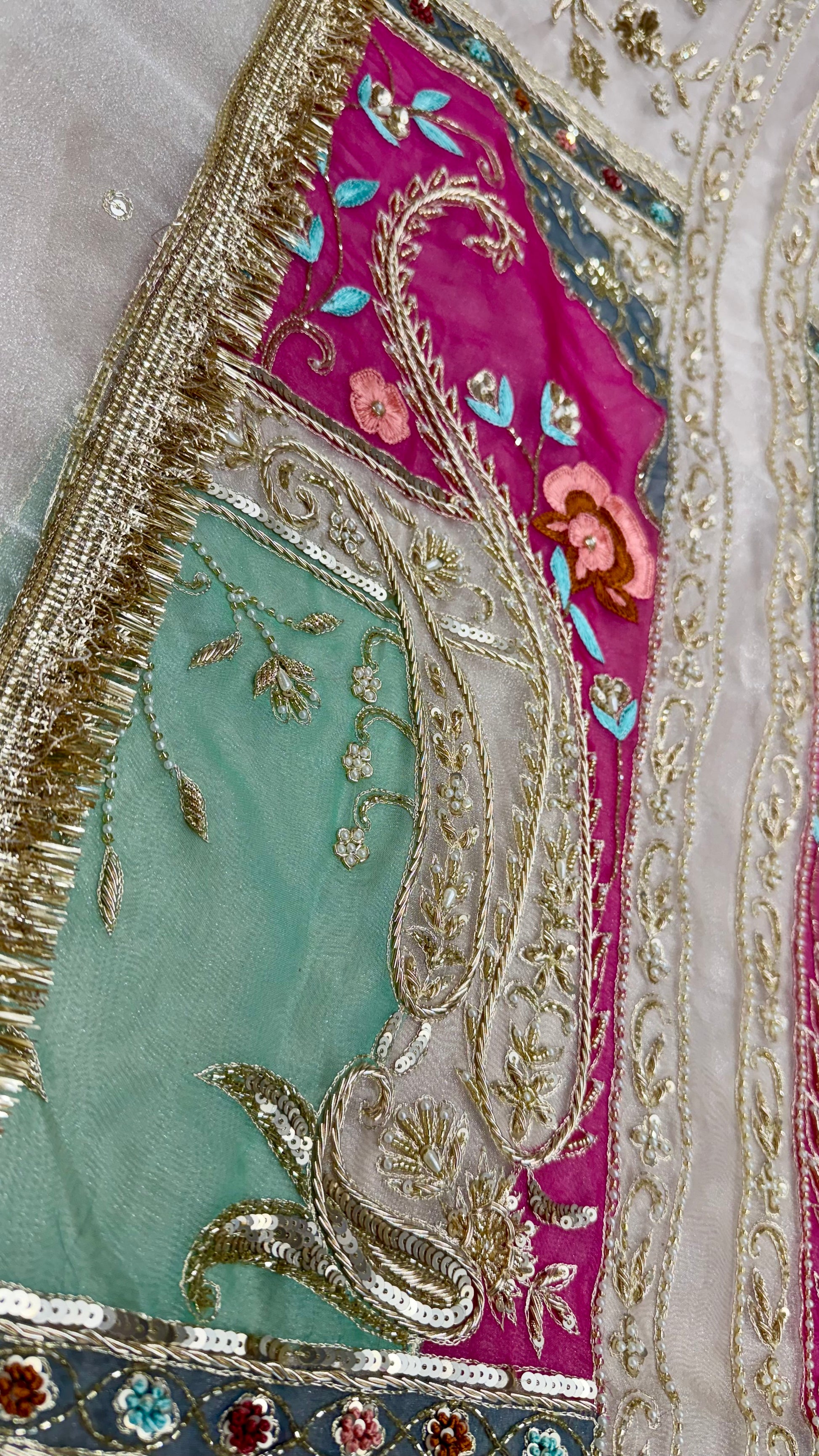 Luxury Pure Glass Organza Hand-Embroidered Unstitched Suit with Zardozi Detailing
