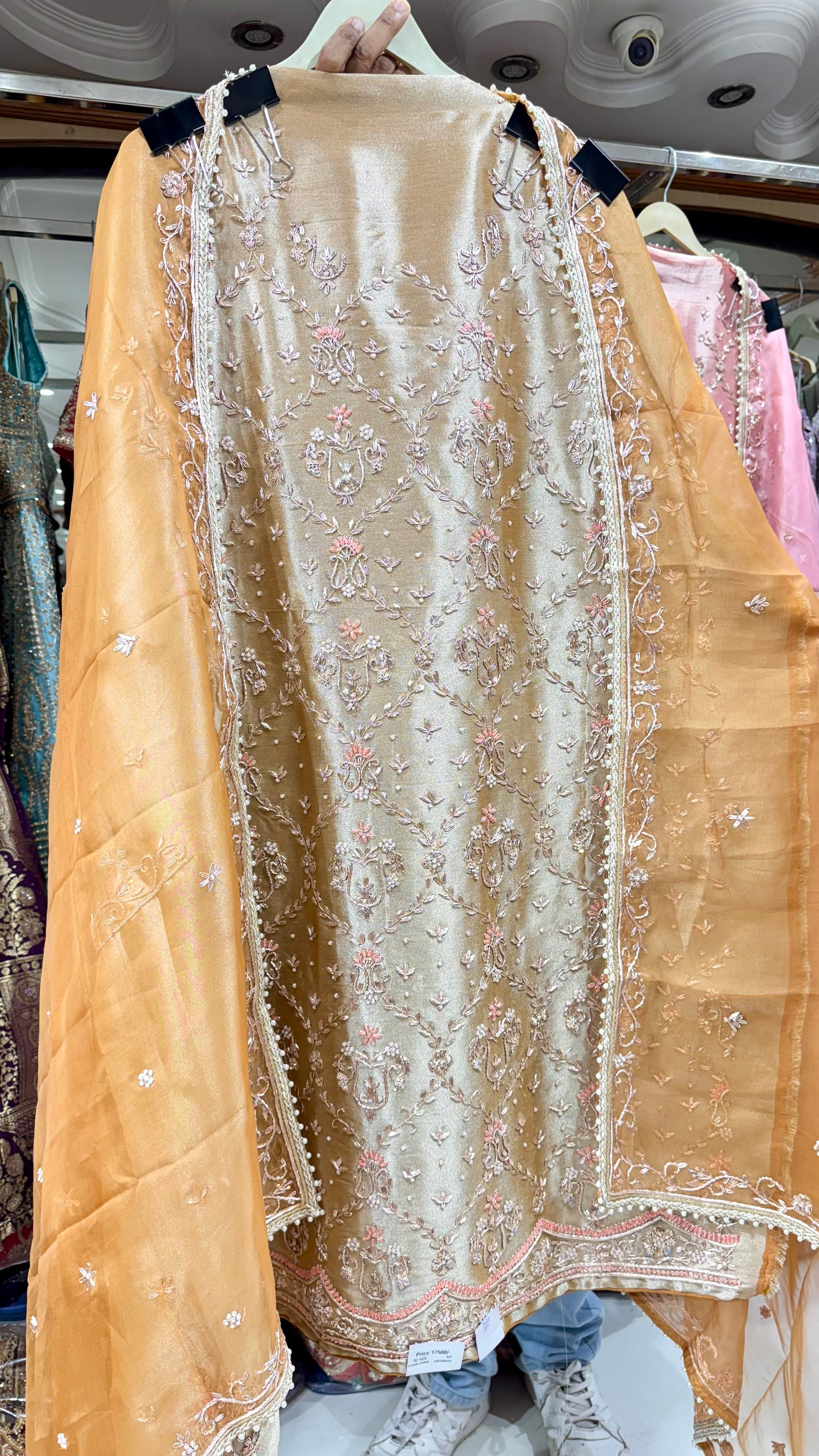 Luxury Shimmer Tissue (Jiraf Silk) Unstitched Suit with Dabka ,Zardozi & Pearl Detailing