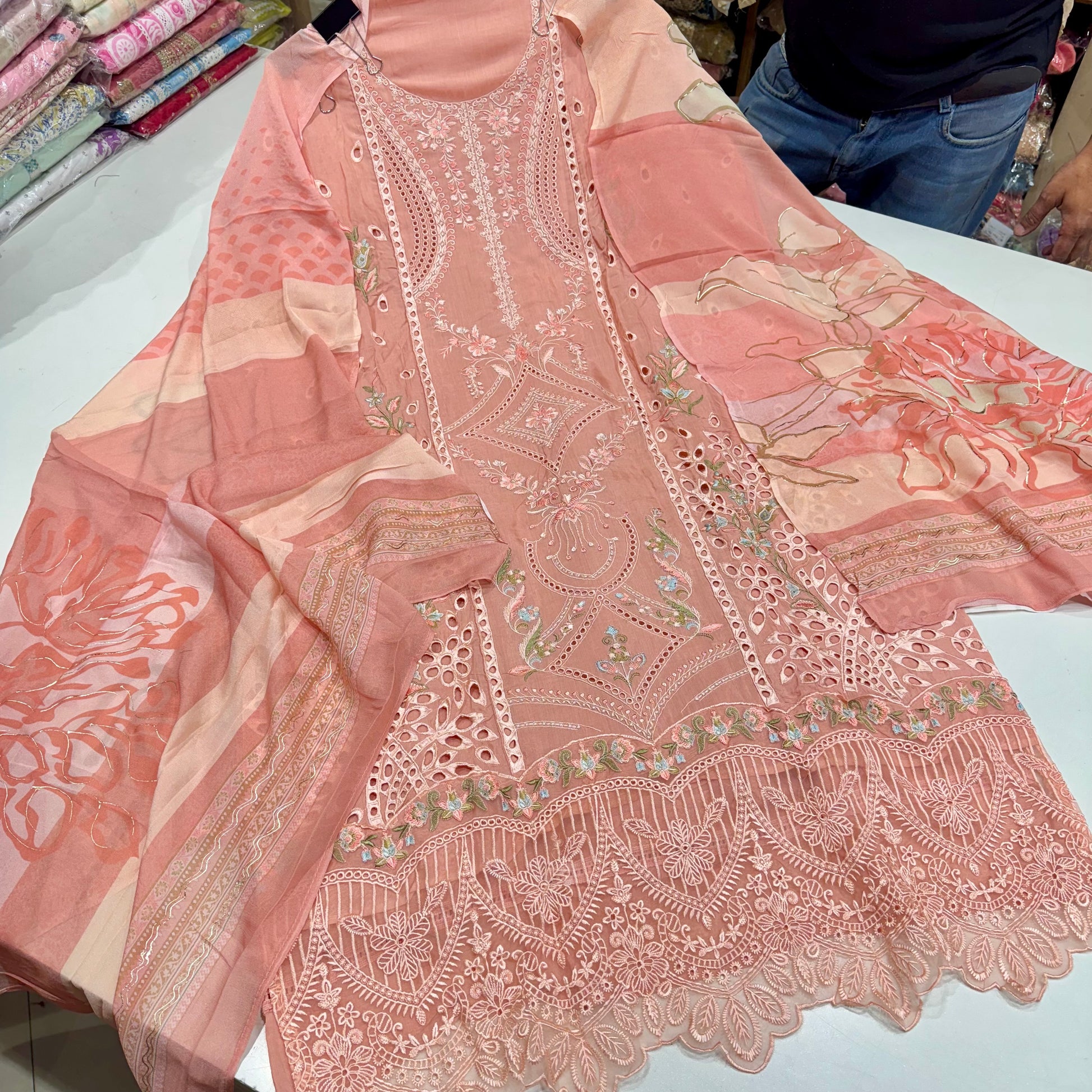 Muslin Pakistani Suit with Embroidered Chinon Dupatta & Soft Silk Bottom (2.5 Meter)