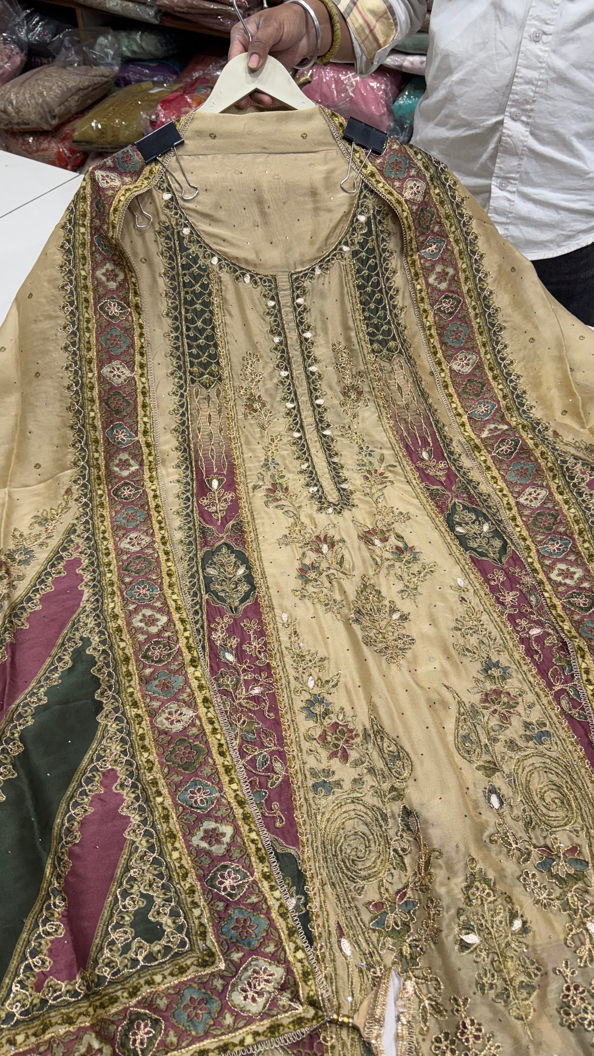 - Embellishments: Intricate zari embroidery with fine threadwork and mirror accents on the neckline, sleeves, and full front panel