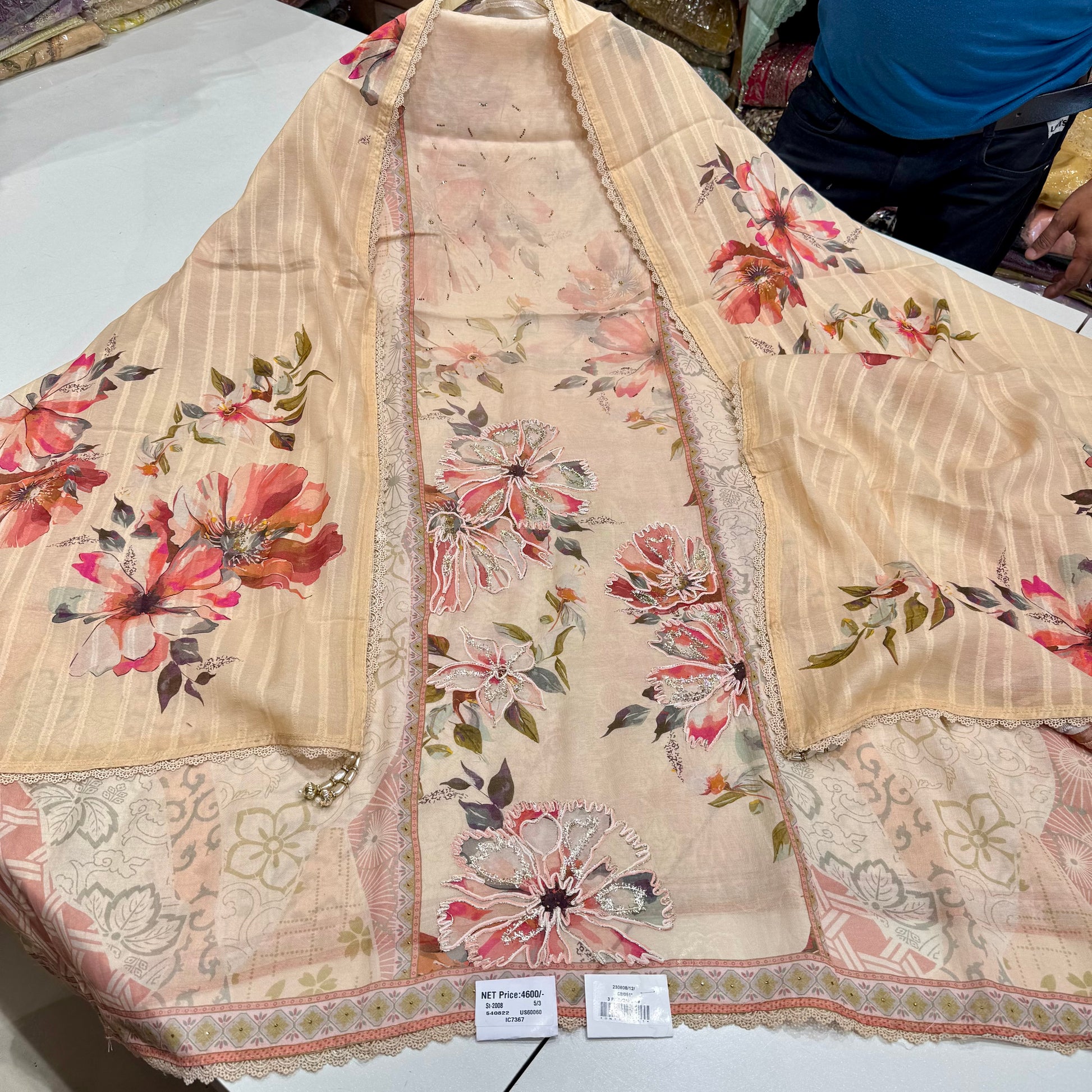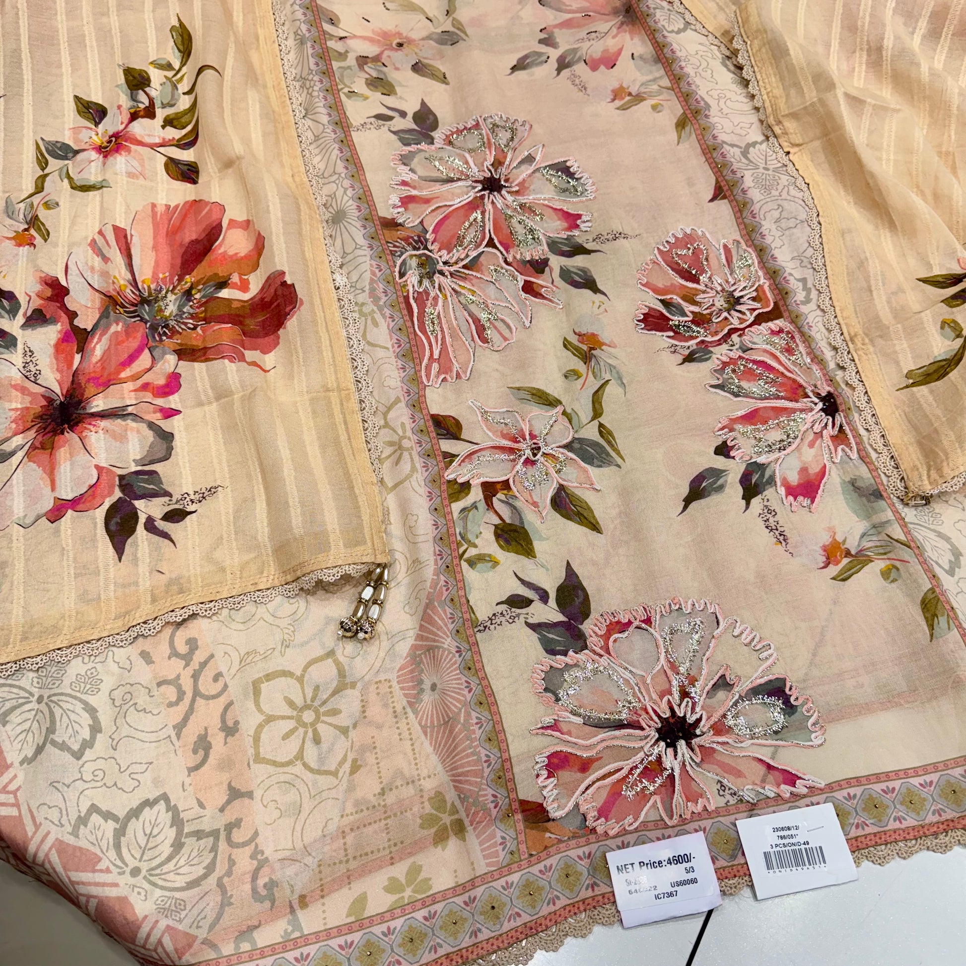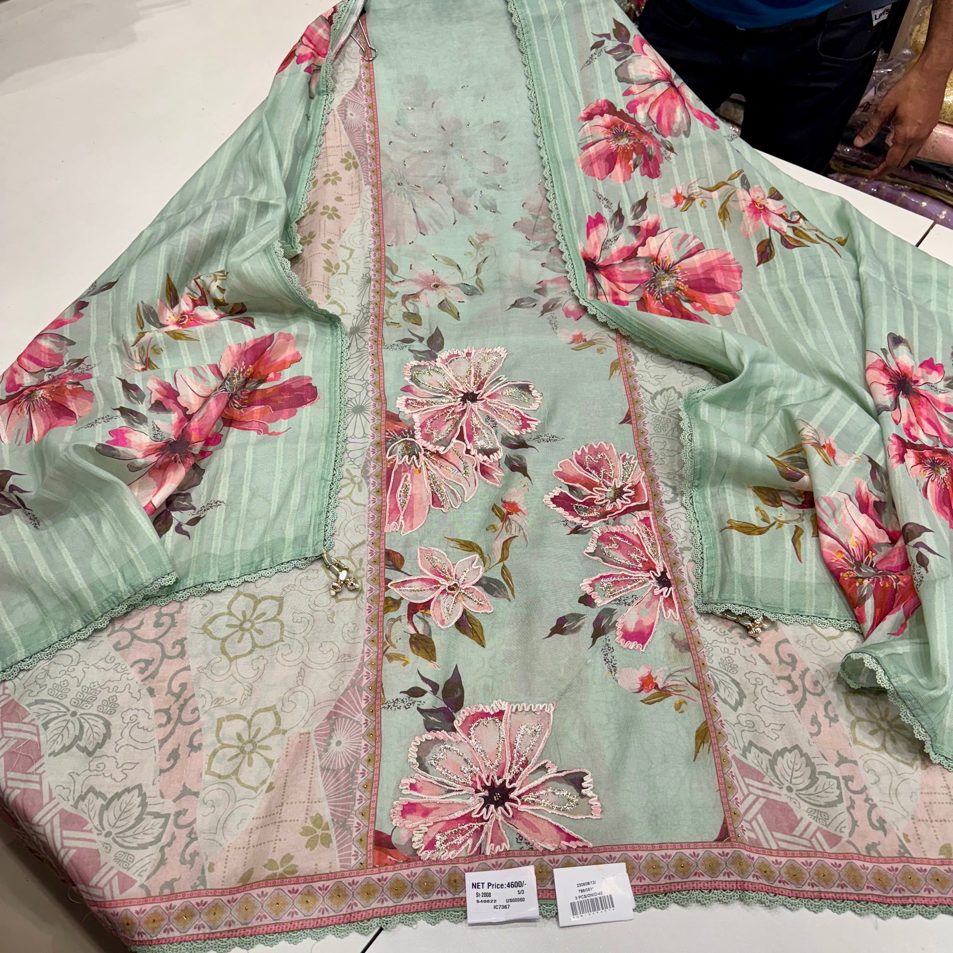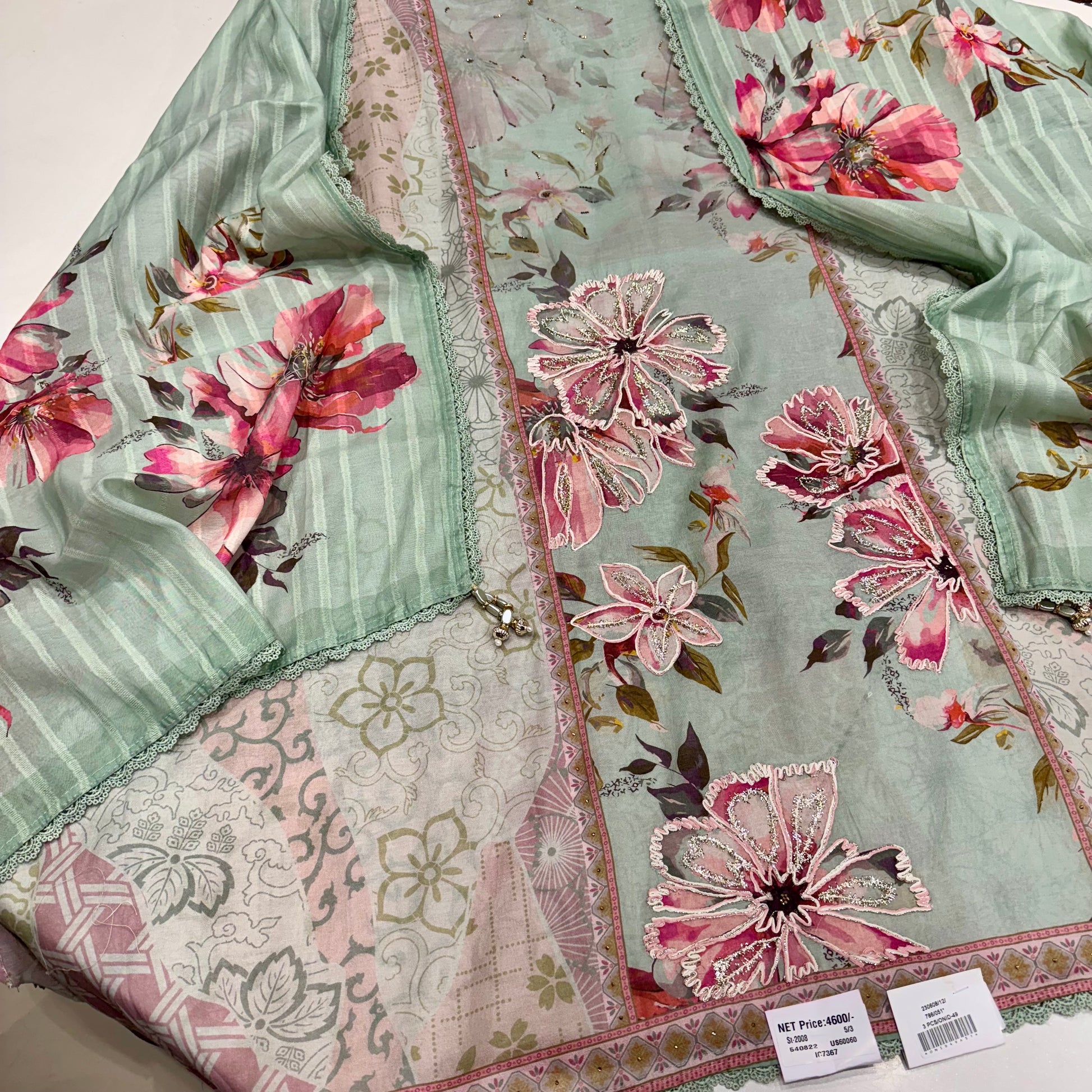 Trendy Pure Mul Mul Cotton Hand-Embroidered Suit with Digital Printed Dupatta & Cotton Bottom