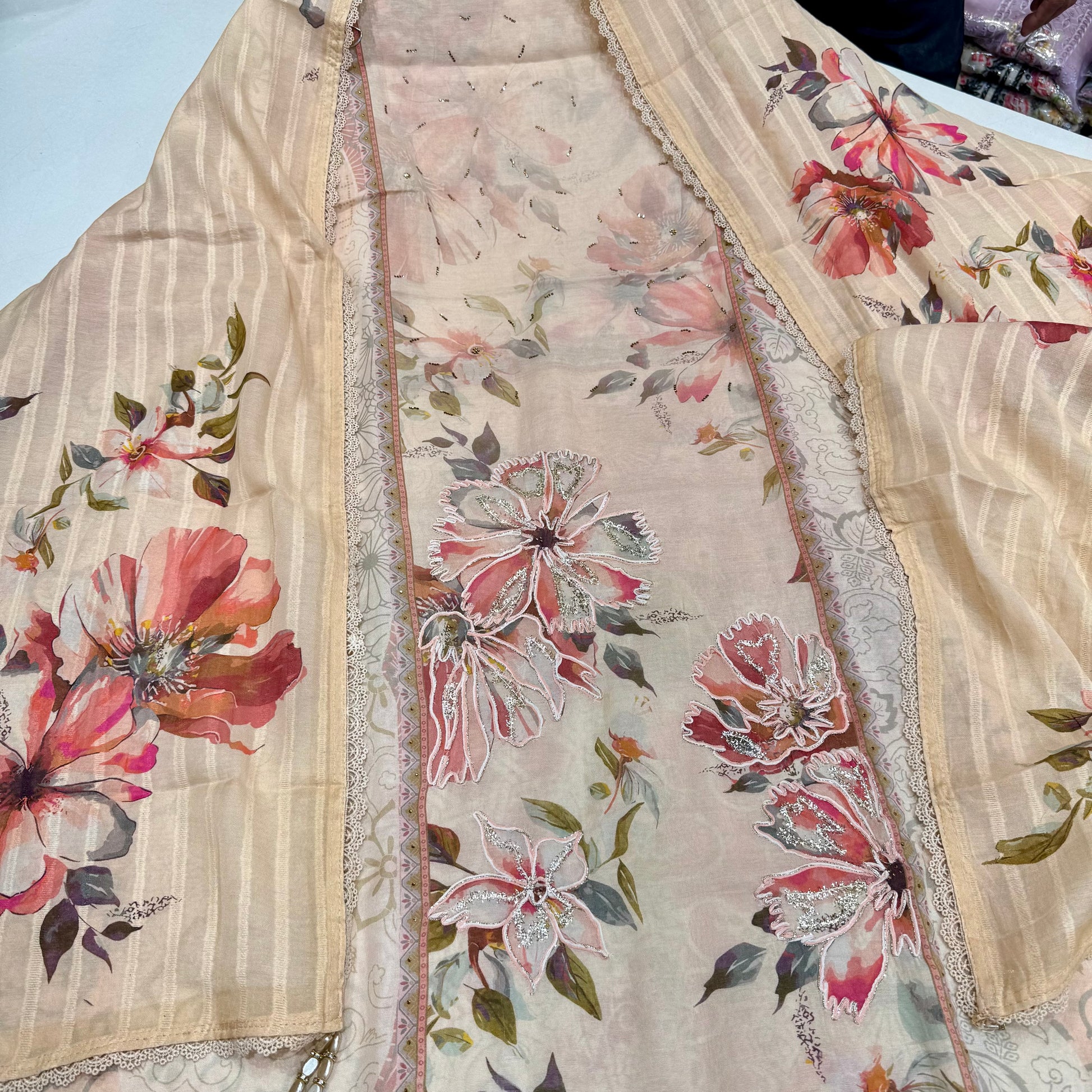 - Dupatta: Coordinated mul mul fabric with vibrant digital floral print and lace edging