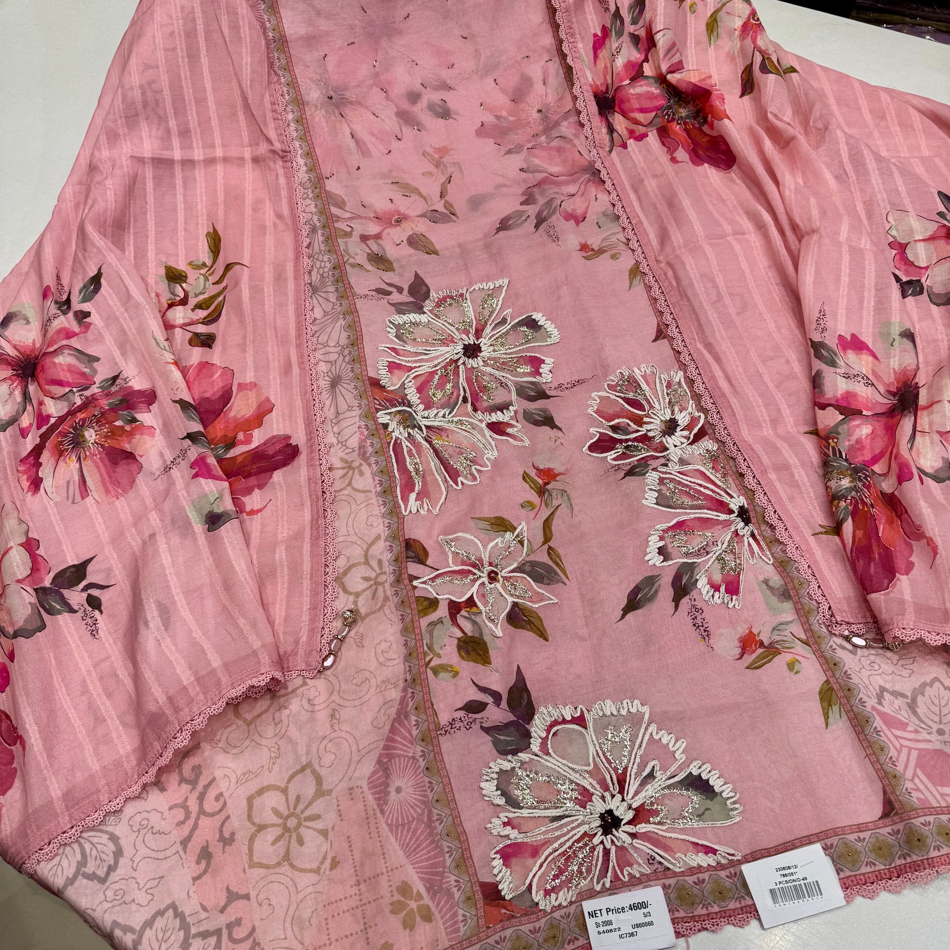 - Design: Soft blush pink base with a mix of embroidery and digital print for a fusion look