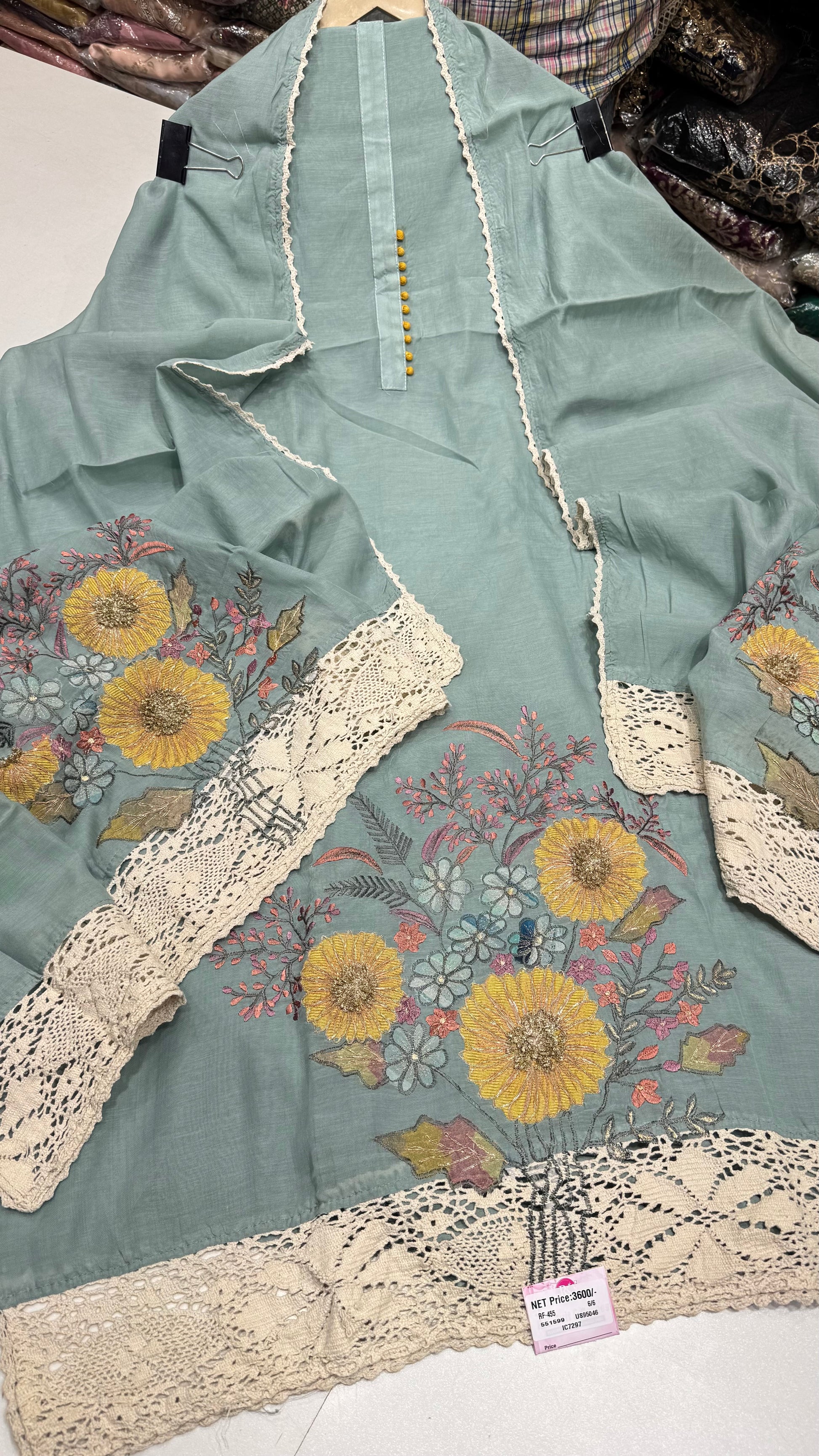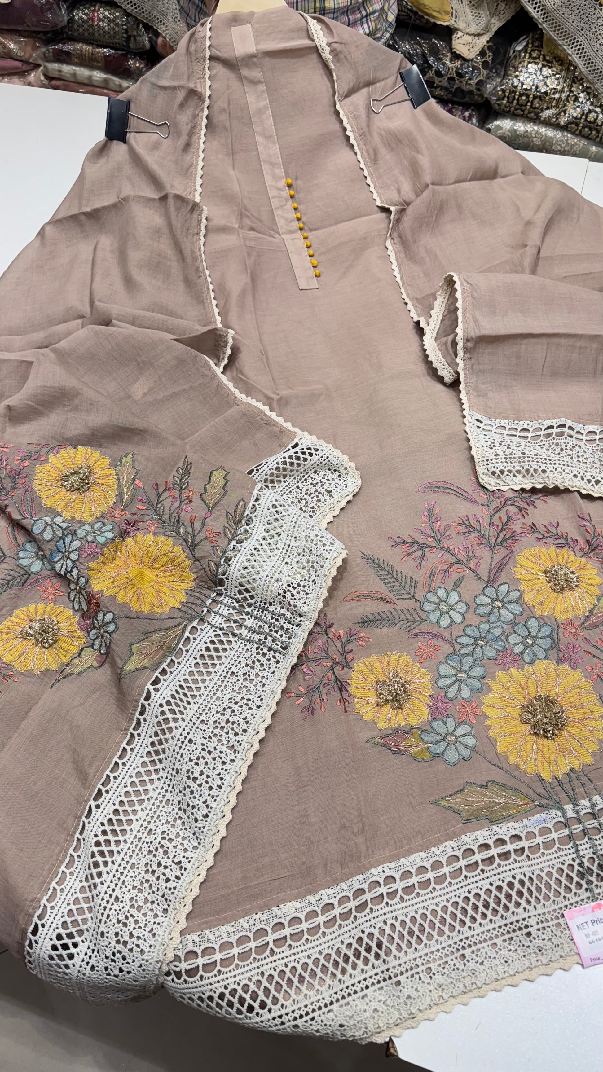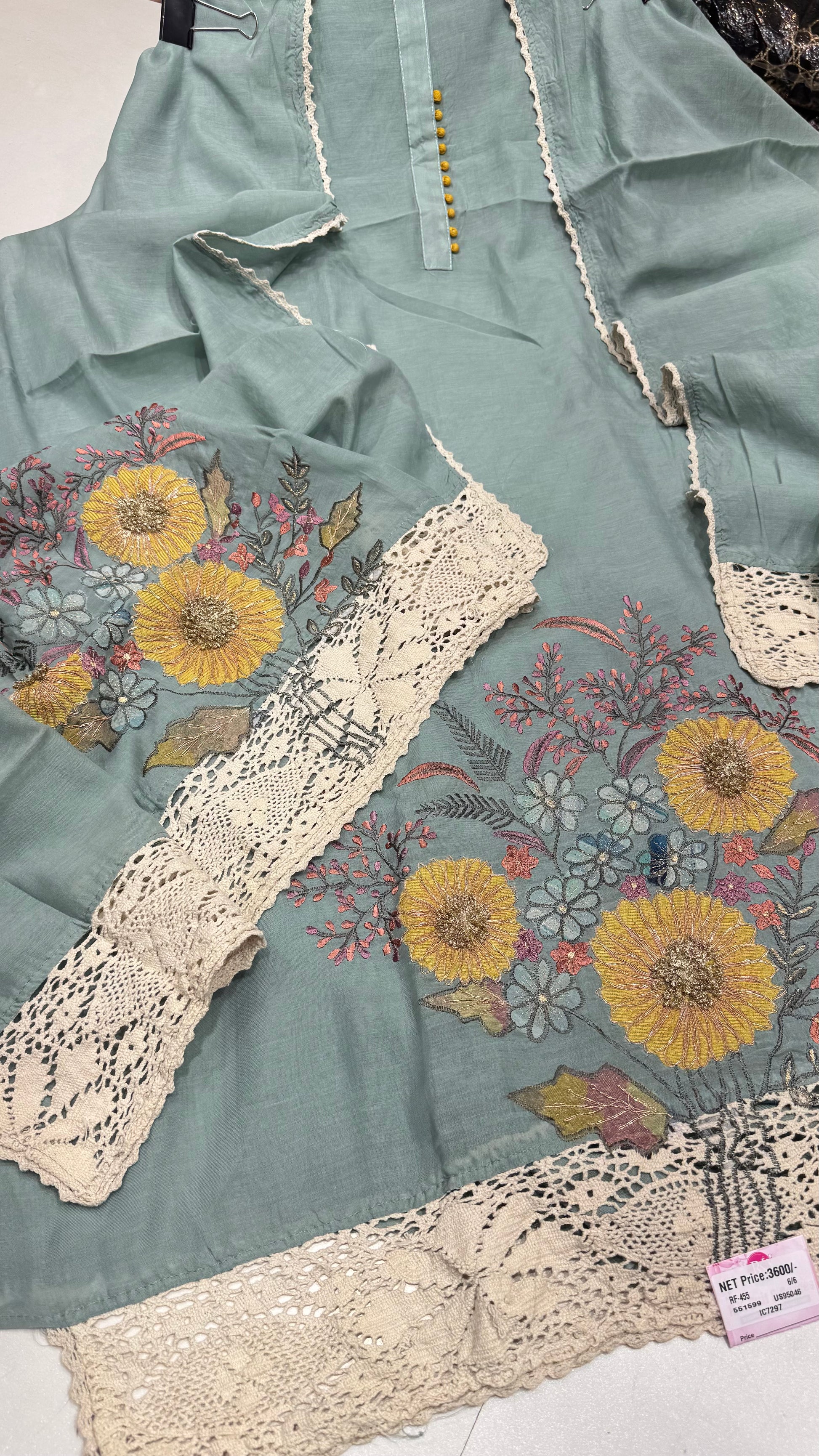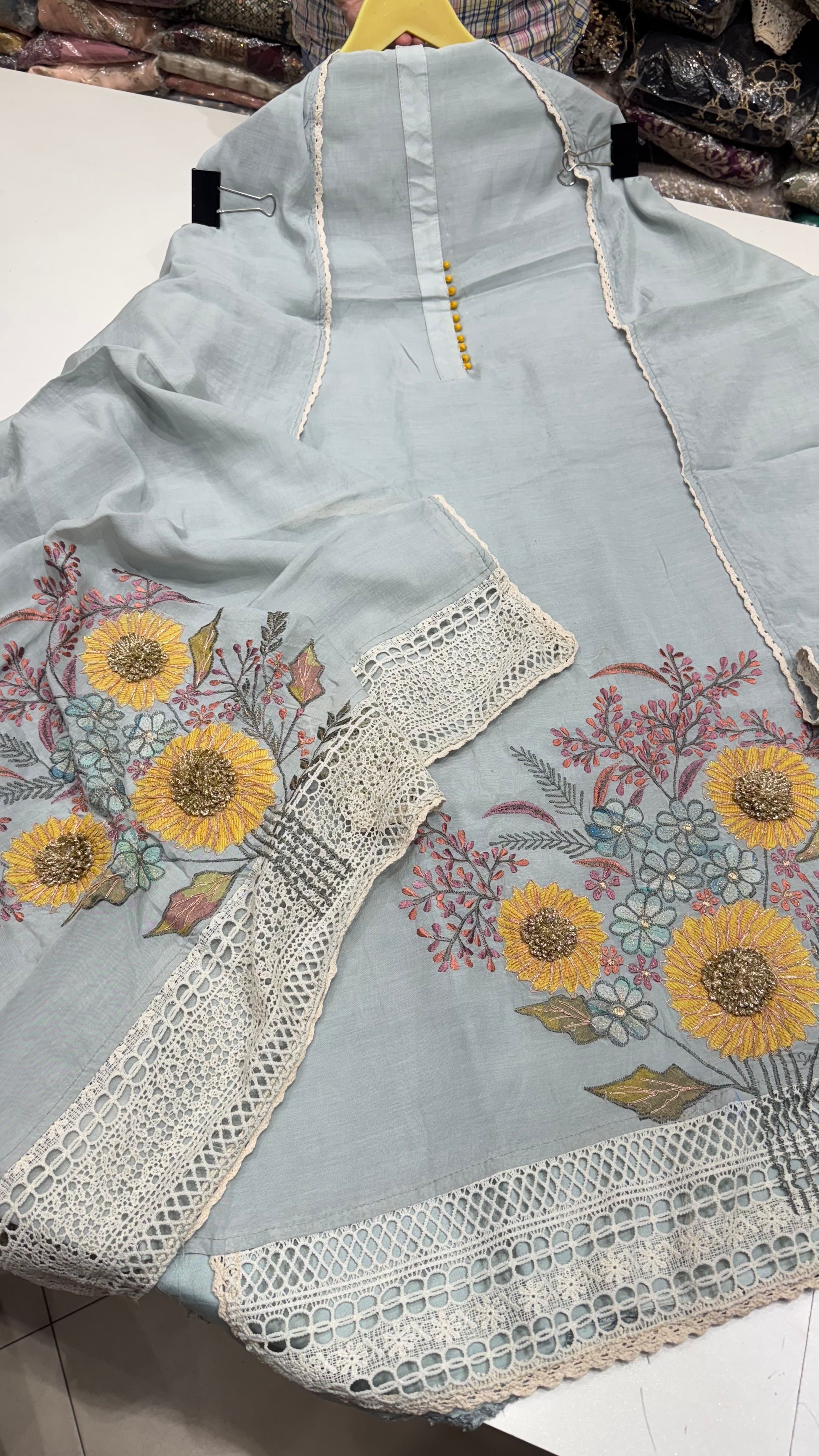 - Features modern floral embroidery in subtle tones with yellow and pastel highlights.