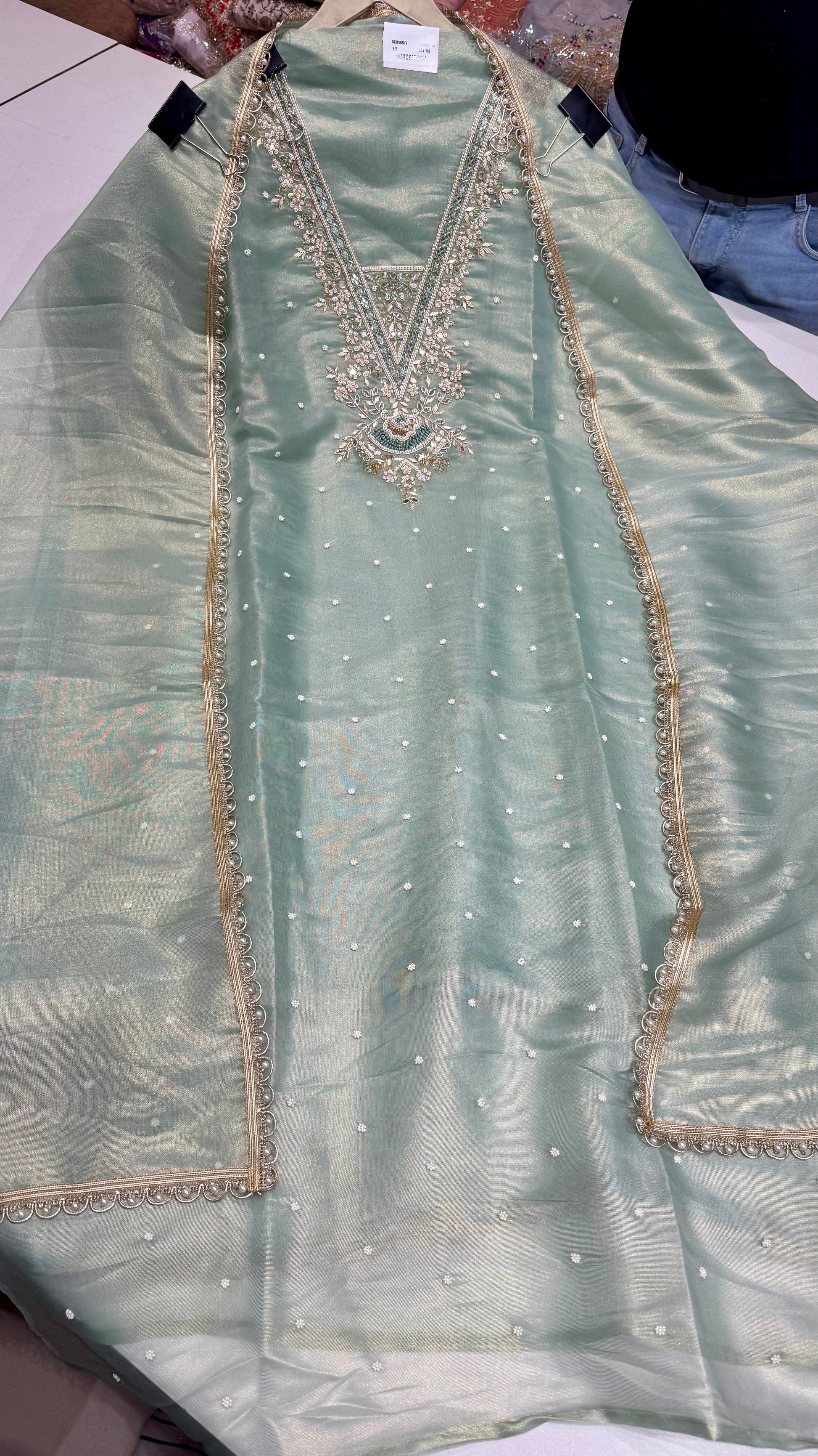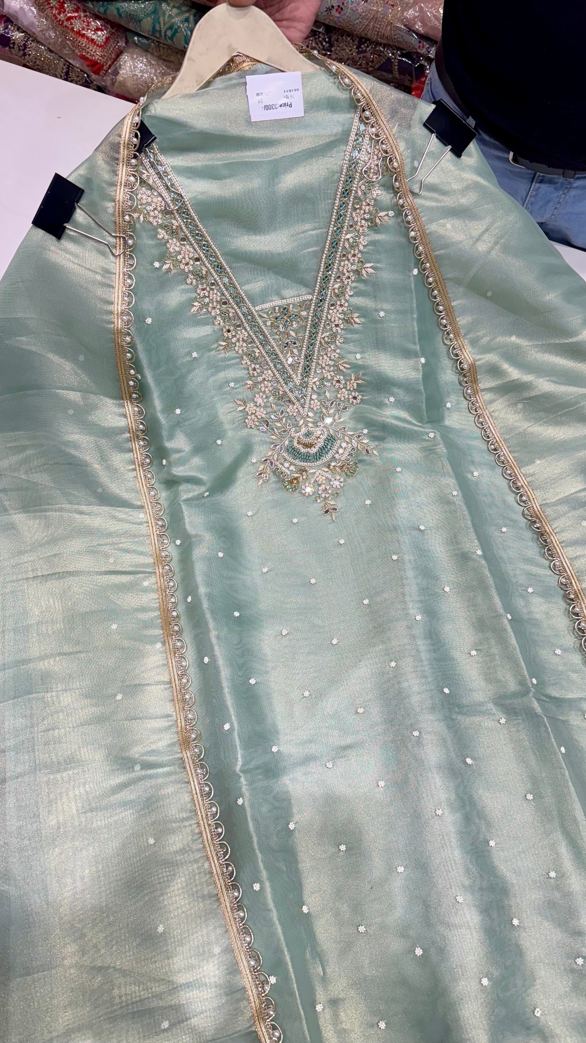 Elegant Burbery Tissue Unstitched Suit with Zardozi & Pearl Embellishments